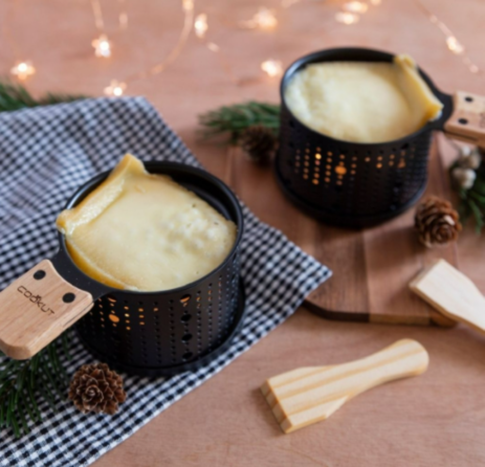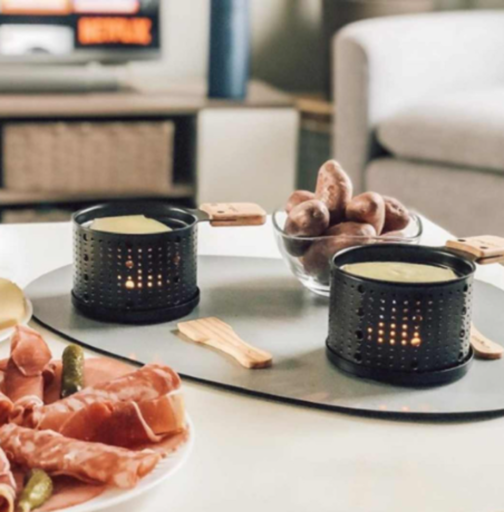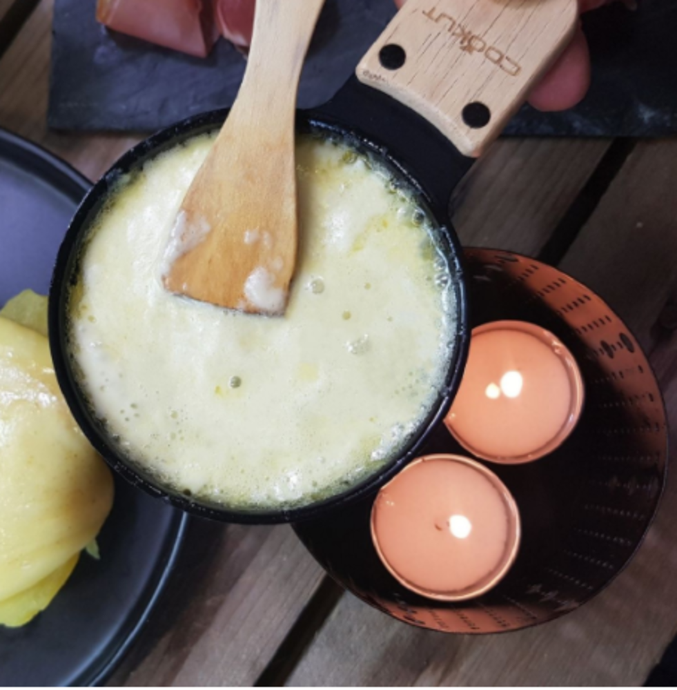 Avec la Raclette à la bougie Cookut, tu peux cuire ta raclette simplement à la bougie, aussi rapidement qu’avec un appareil électrique à raclette.
