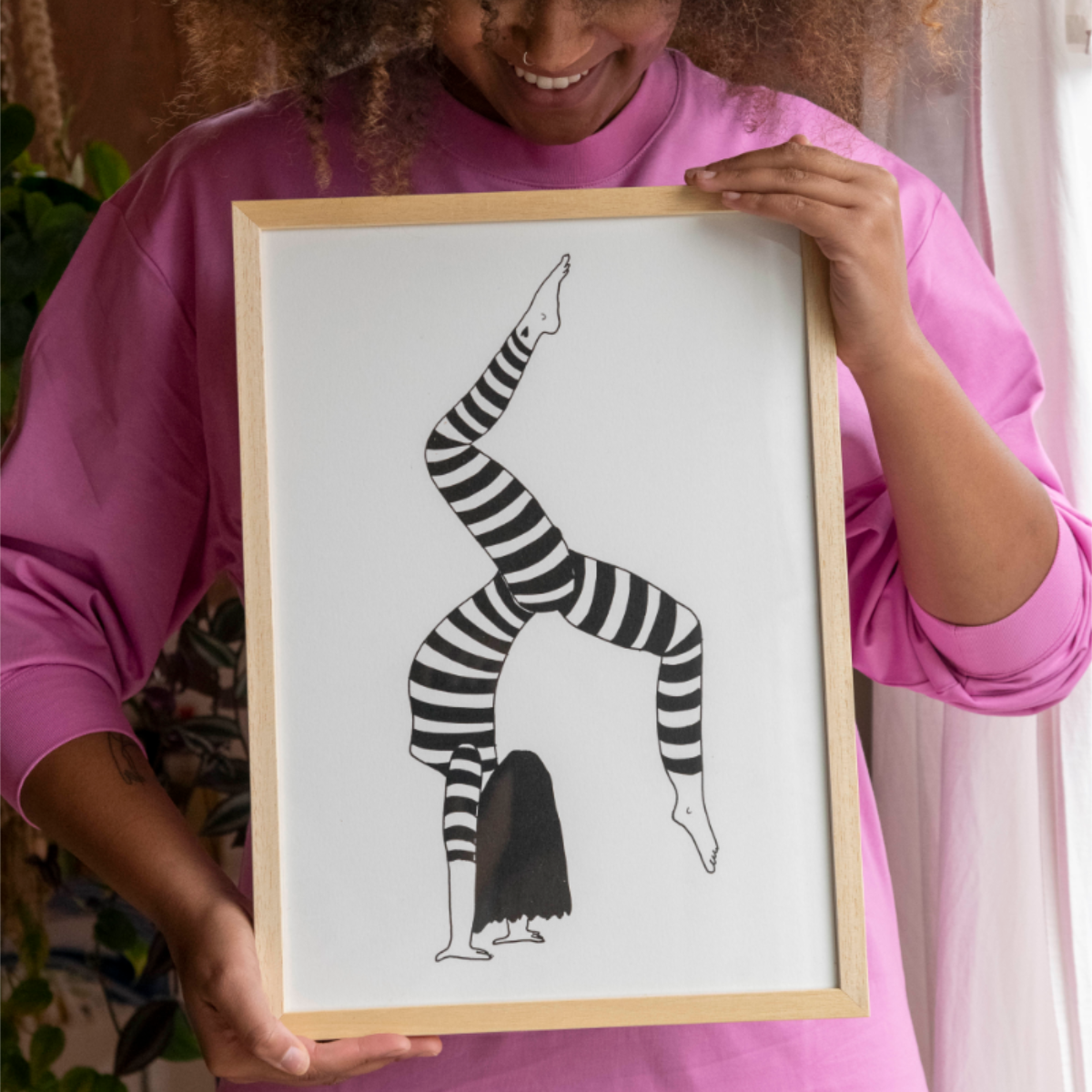 • On adore cette jeune femme qui marche sur les mains, son style décalé, son petit pyjama rayé et l’aisance de son mouvement.