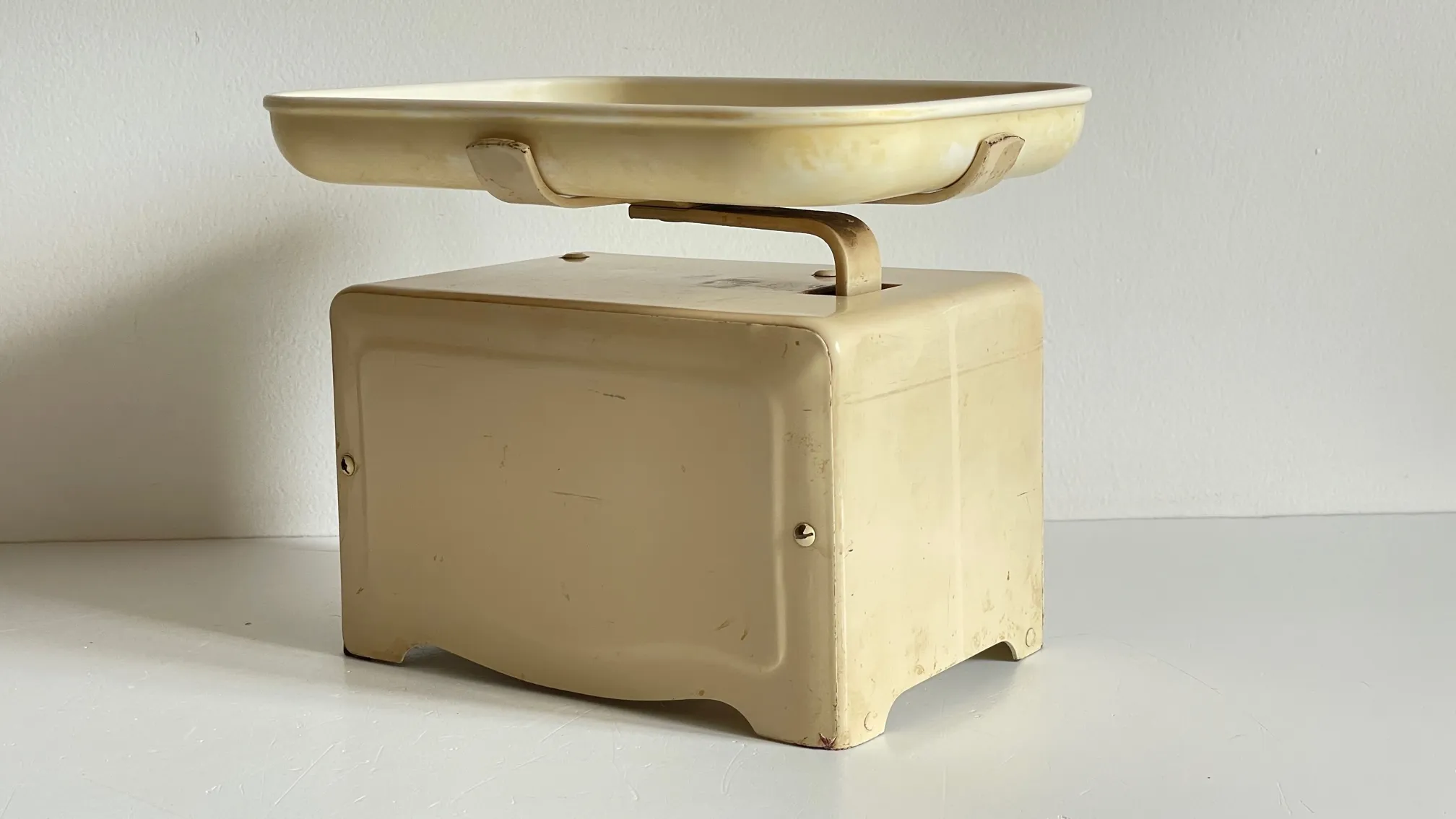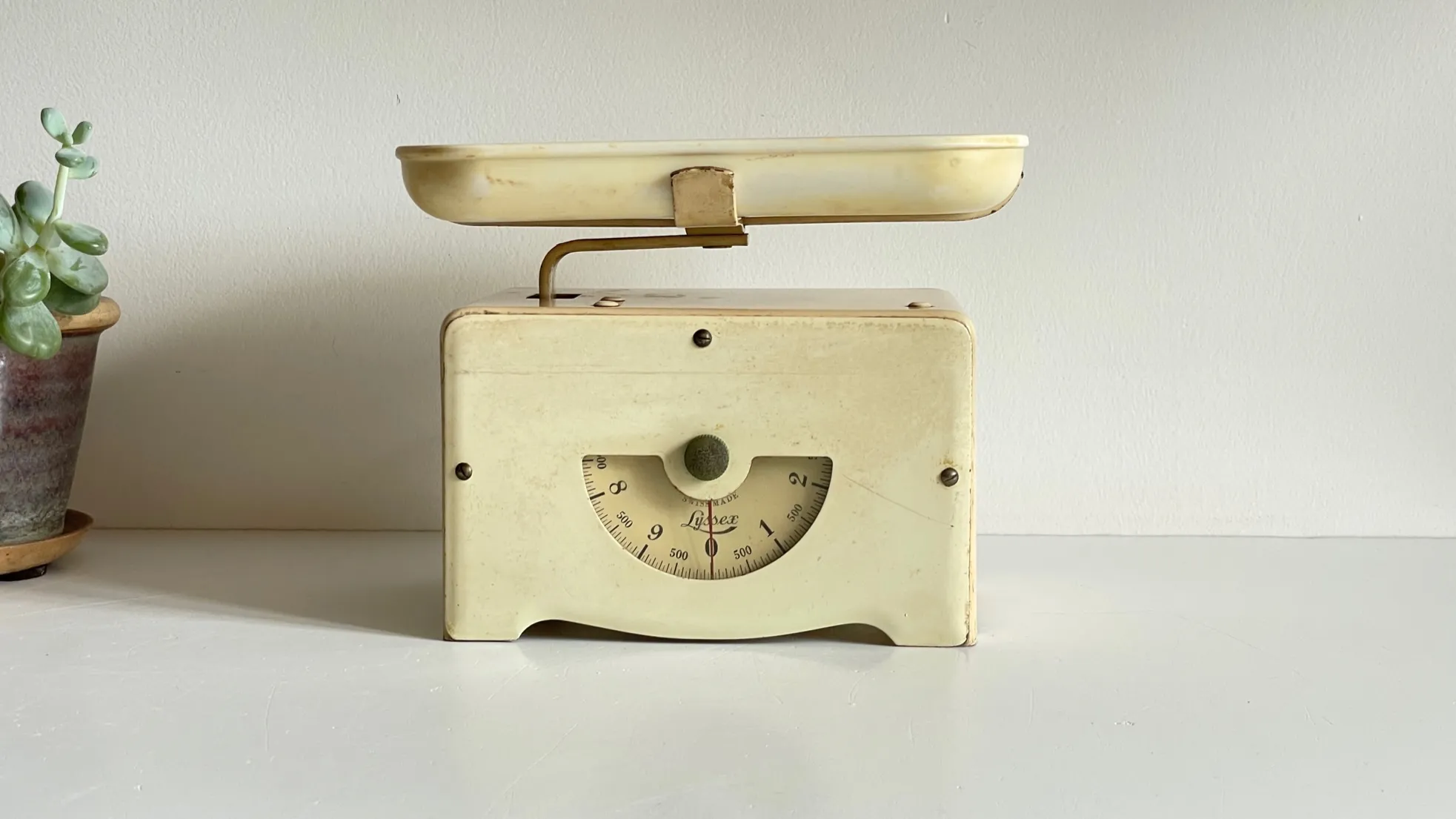 Très belle et inspirante BALANCE Alimentaire Vintage marque LYSSEX – Swiss Made, un modèle poétique, tout en métal, laiton et son plateau en synthétique.