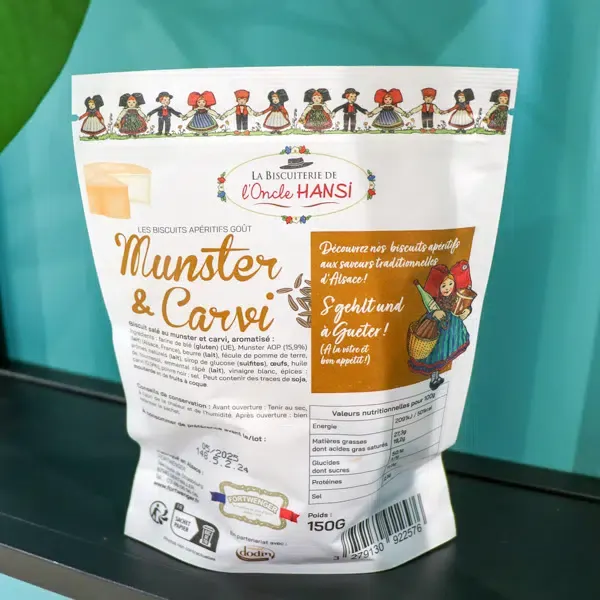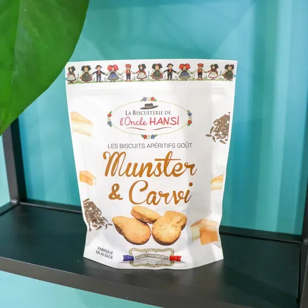 Retrouvez les saveurs traditionnelles de la gastronomie alsacienne grâce à ces nouveaux biscuits apéritif. Ces biscuits sont fabriqués avec du Munster AOP d’Alsace et de subtiles notes de carvi.