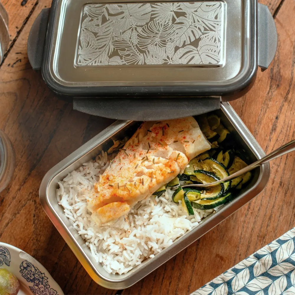 Grande boîte repas micro-ondable (sans le couvercle) en inox. Joint silicone et système de fermeture en PP. Fabriquée en Chine par une usine partenaire de la marque Gaspajoe, choisie pour son savoir-faire et son respect du droit du travail international.