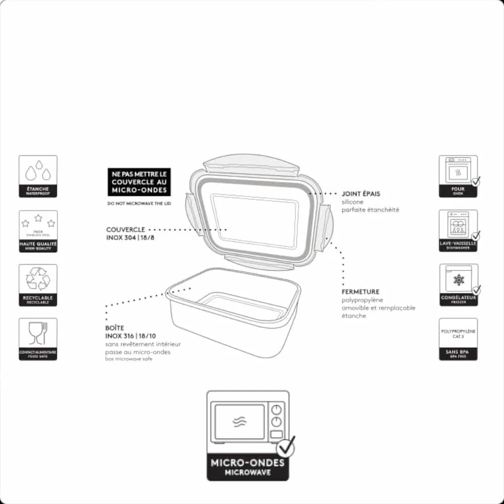 Assurez-vous que votre plat maison soit froid ou à température ambiante avant de le placer dans votre boîte repas micro-ondable et de refermer la boîte. Autrement votre plat sera comme sous-vide et cela rendra l’ouverture de la boîte difficile !