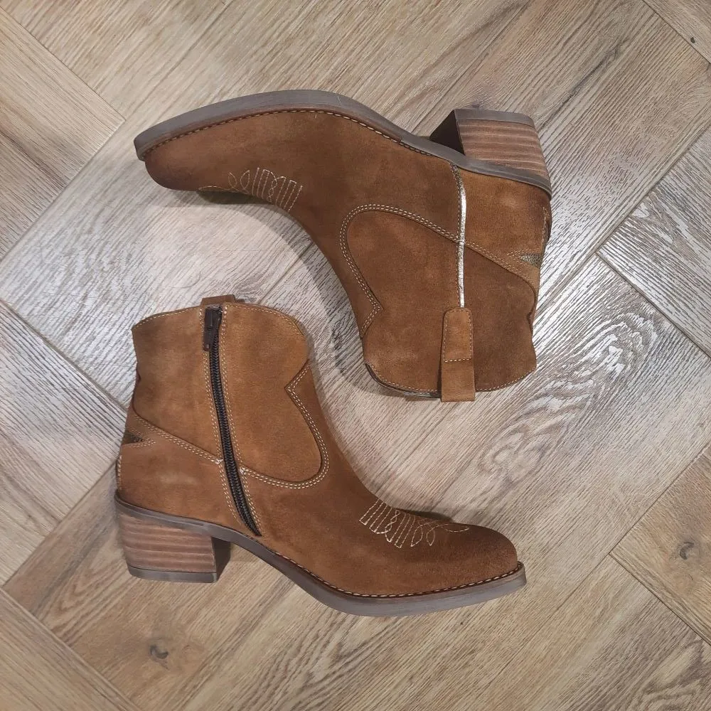 Jolie bottine style santiag avec son talon biseauté de 5cm.