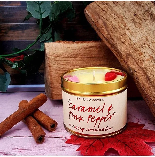 La bougie Bomb Cosmetics avec comme parfum, une touche de caramel et de baie roses
