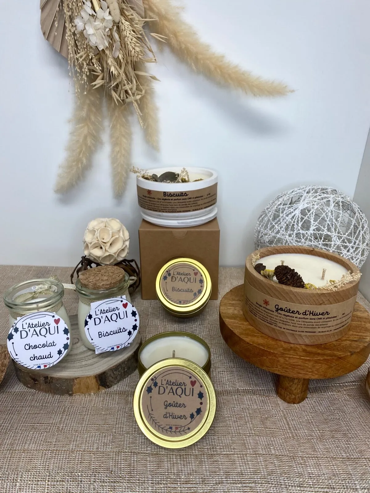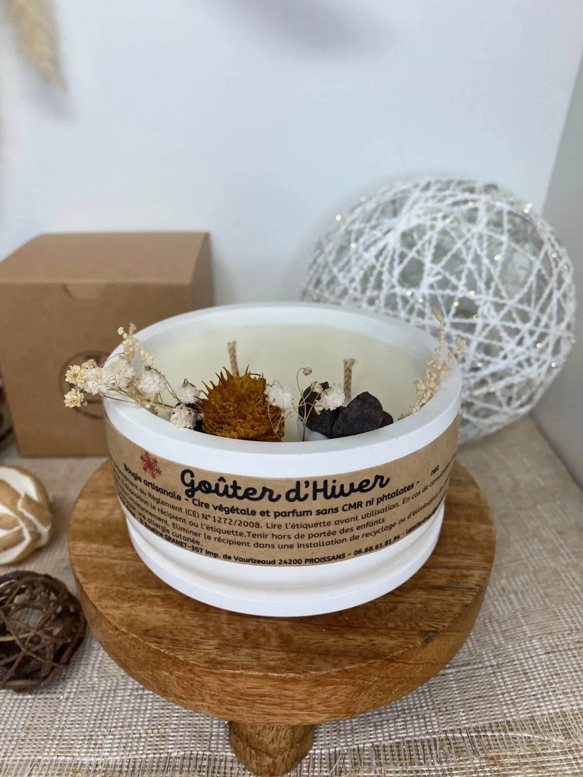 Bougie fleurie fabriquée à la main en Dordogne. Pot en bois créé artisanalement par un menuisier de Dordogne ou pot en jesmonite créé par l’Atelier d’Aqui. Mèche en coton non traité et âme en papier.