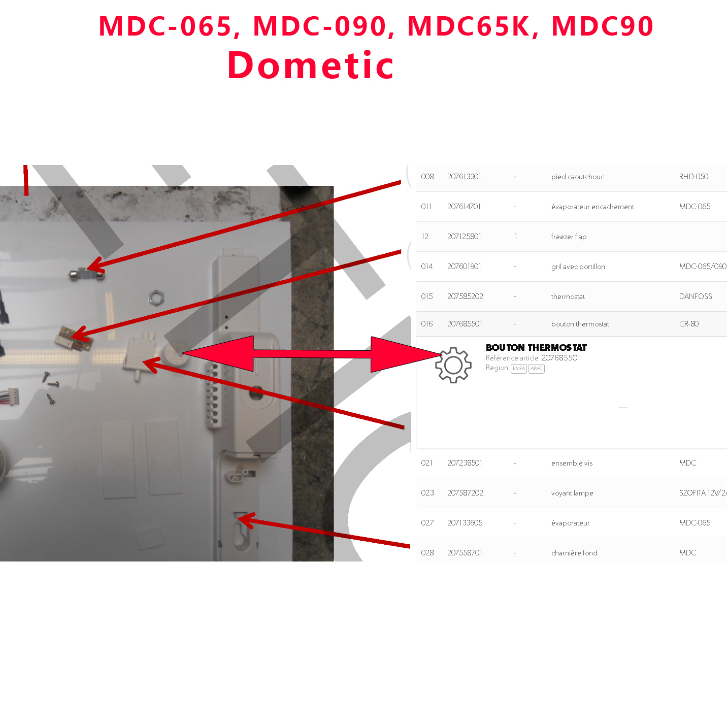 Pour vérifier si votre appareils comporte bien ce boutonr, merci de nous contacter tel 01.84.20.86.07 et munissez vous pour vérifier la compatibilité de votre numéro de produit de votre appareil Dometic (qui se trouve sur l’étiquette signalétique de votre réfrigérateur). repère n° sur la vue éclatée