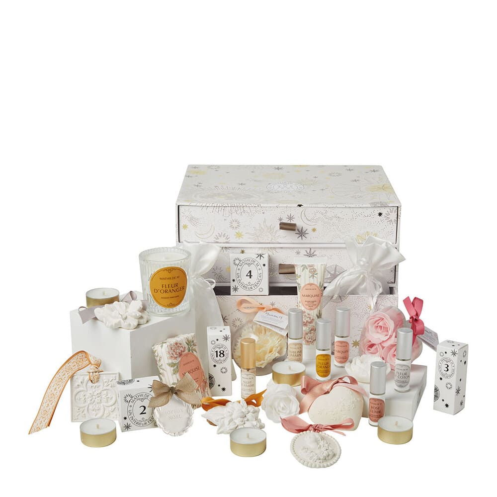 Chaque jour, plongez dans l’univers poétique et raffiné de Mathilde M avec le fabuleux Calendrier de l’Avent Fête Céleste. Ce joli coffret réutilisable en boite à bijoux renferme 24 surprises uniques pour attendre Noël en parfum.