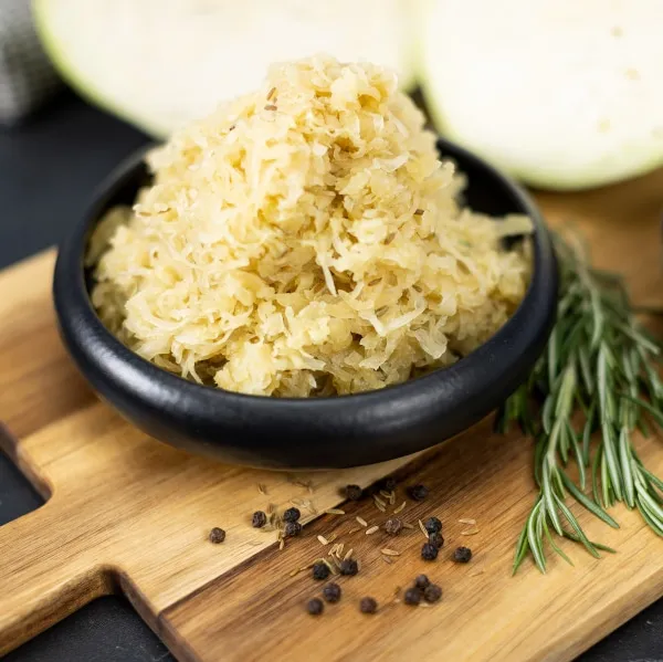 La choucroute mijote longuement avec des lardons et assaisonné au Riesling d’Alsace ; puis elle est mise dans une pochette sous vide, prête à être réchauffée en quelques minutes.