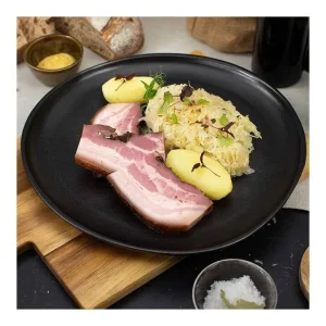 Cette choucroute est cuisinée aux lardons et au Riesling. Prête en quelques minutes, elle s’accompagne parfaitement de garnitures de la rubrique charcuterie. Poche de 700 g.