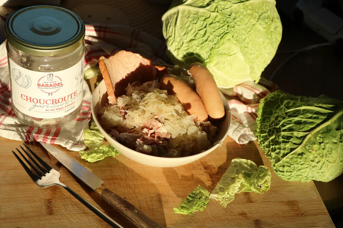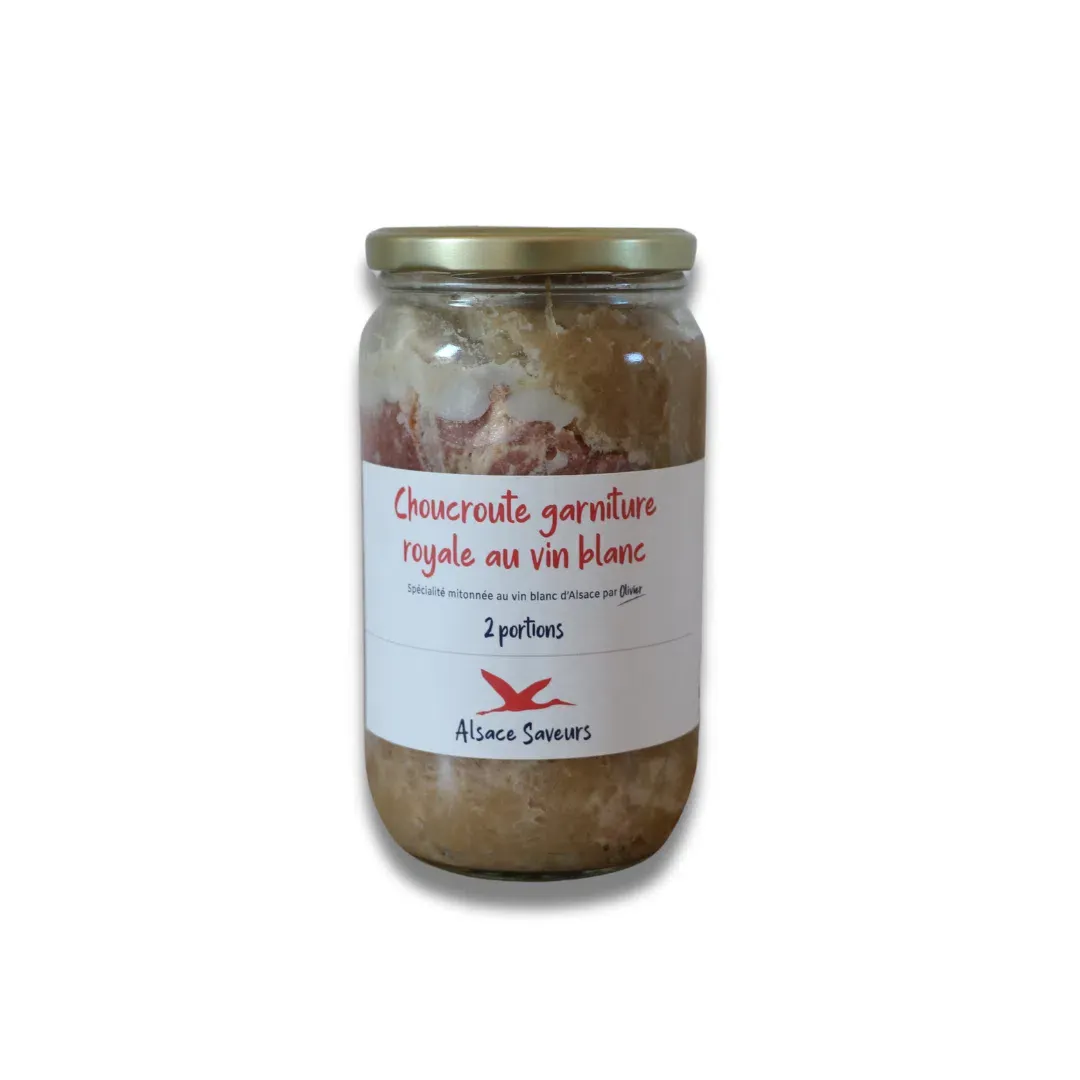 Du chou d’Alsace cuisiné aux lardons, saindoux et vin blanc d’Alsace. Accompagné de ses garnitures phares comme la viande de porc fumée, le lard cuit, les saucisses fumées et nos incontournables saucisses de Strasbourg (knacks).