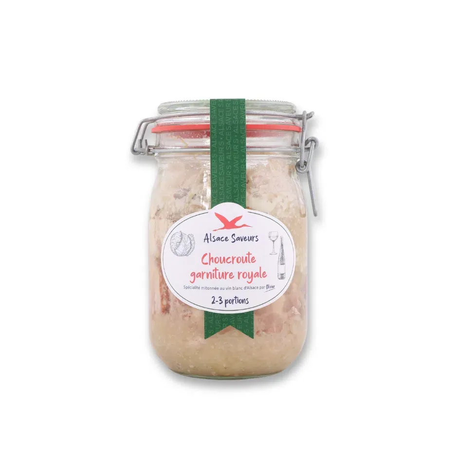 Choucroute d’Alsace cuisinée aux lardons, au saindoux et au vin blanc d’Alsace. Garniture (33%) : 2 portions de viande de porc fumé, 2 portions de lard demi-sel, 2 saucisses fumées, 2 saucisses de Strasbourg. Pour 2 à 3 personnes.
