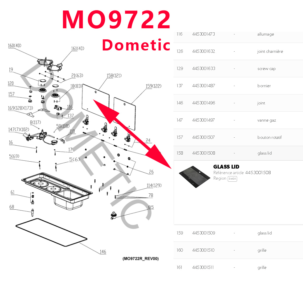 Couvercle ou plateau en verre noir, côté GAUCHE des ensembles gazinières et éviers MO9722A Dometic