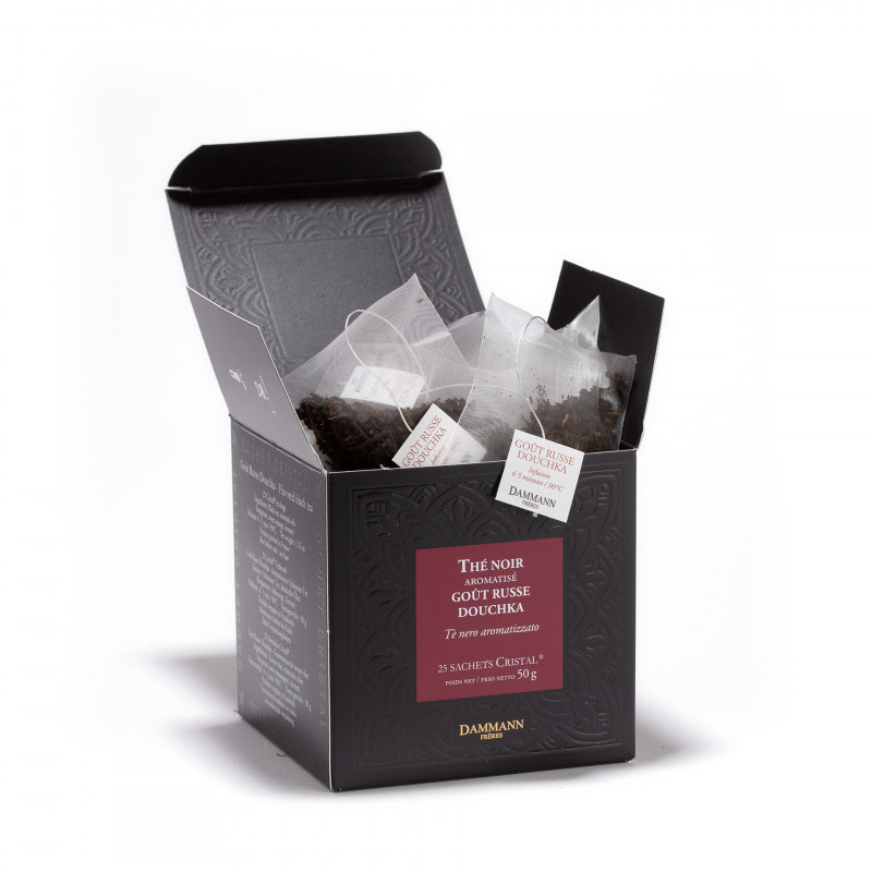 Thé de Chine parfumé aux huiles essentielles d’agrumes (citron, orange) accompagné de bergamote. Le thé Gout Russe Douchka offre une tasse acidulée et très rafraîchissante.
