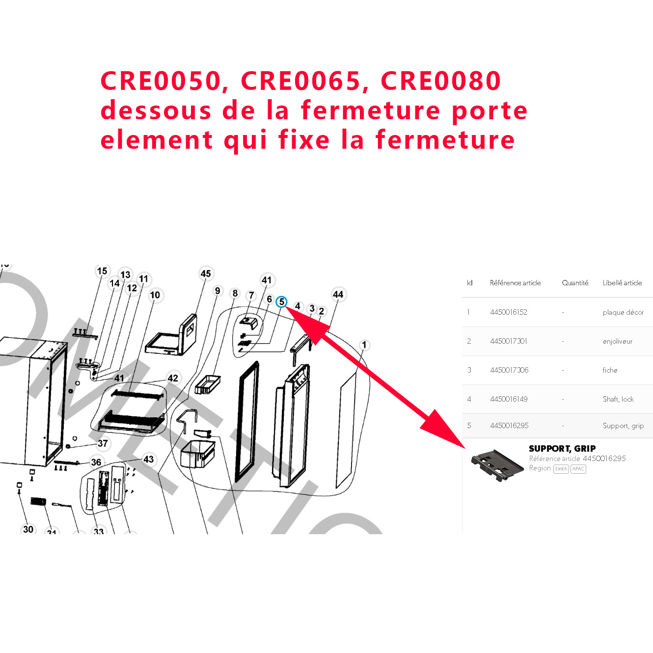 Pour vérifier si votre réfrigérateur comporte bien cette piece du dessous de la fermeture, merci de nous contacter tel 01.84.20.86.07 et munissez vous pour vérifier la compatibilité de votre numéro de produit de votre appareil Dometic (qui se trouve sur l’étiquette signalétique).