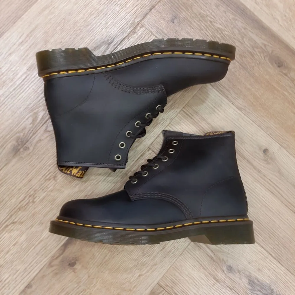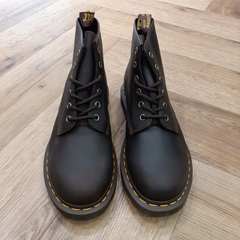 Le cuir Crazy Horse est un classique DM’s respecté et un incontournable de nos modèles les plus iconiques. Ce cuir épais à l’allure savamment vieillie s’embellira au fil du temps et sera confortable dès le premier pas. Nous avons réinventé nos boots 101 en cuir Crazy Horse avec des œillets en cuivre et des lacets marron. Elles reposent sur notre semelle à coussin d’air crantée et se parent de nos surpiqûres jaunes. Elles disposent aussi d’une languette AirWair au talon.