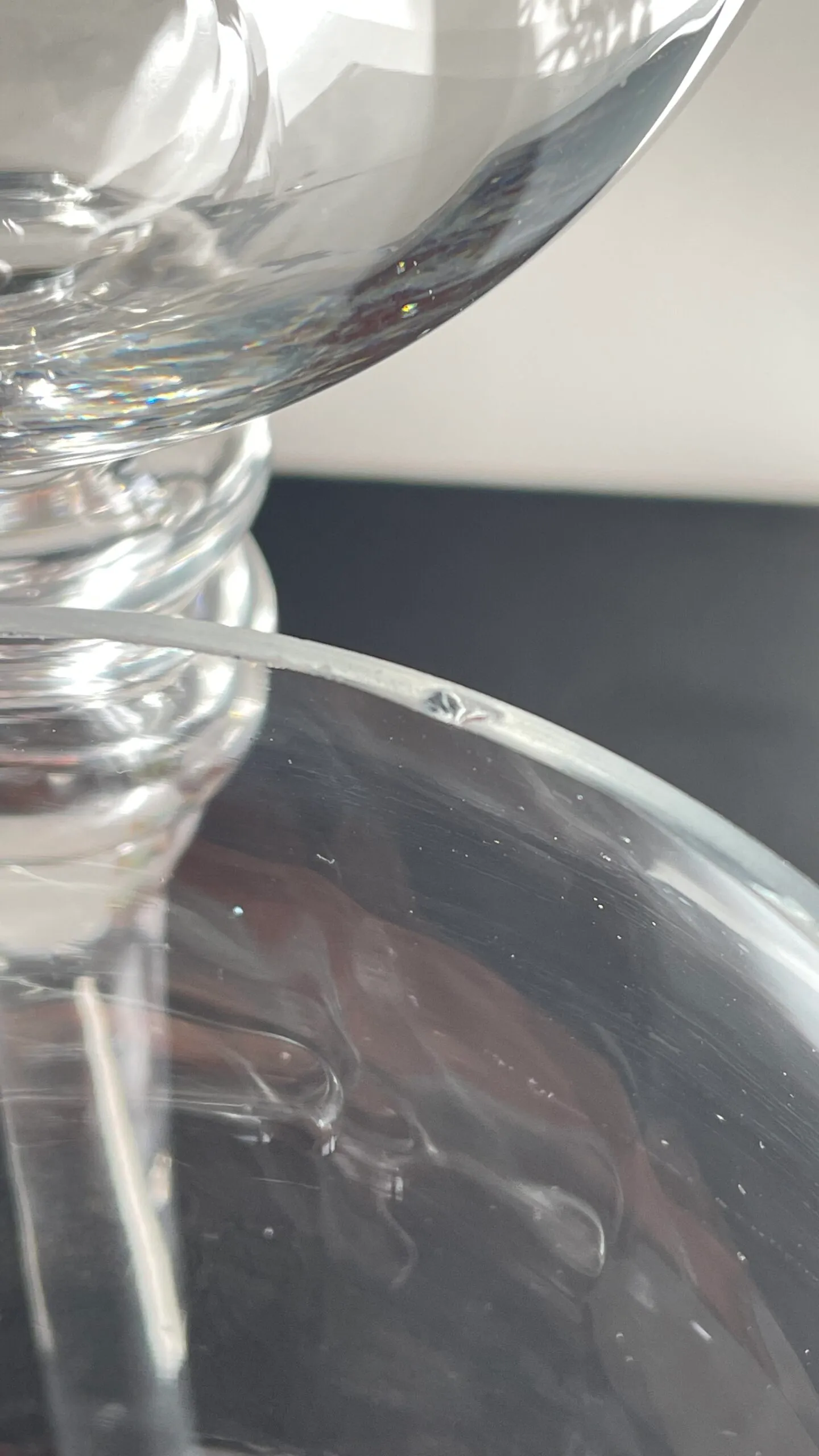 Très bon état, 1 mini éclat sur le bord intérieur du plus grand, un mini manque sur le rebord du plus petit, 1 mini trace polie sur chaque pieds, vous pouvez voir des Bulles dans la matière qui assurent du travail de Cristal soufflé, une travail de Qualité, on peut aussi observer de délicates lignes ornementales dans l’arrondi de chaque verre (le tout visible sur les photos). Prix pour la paire.