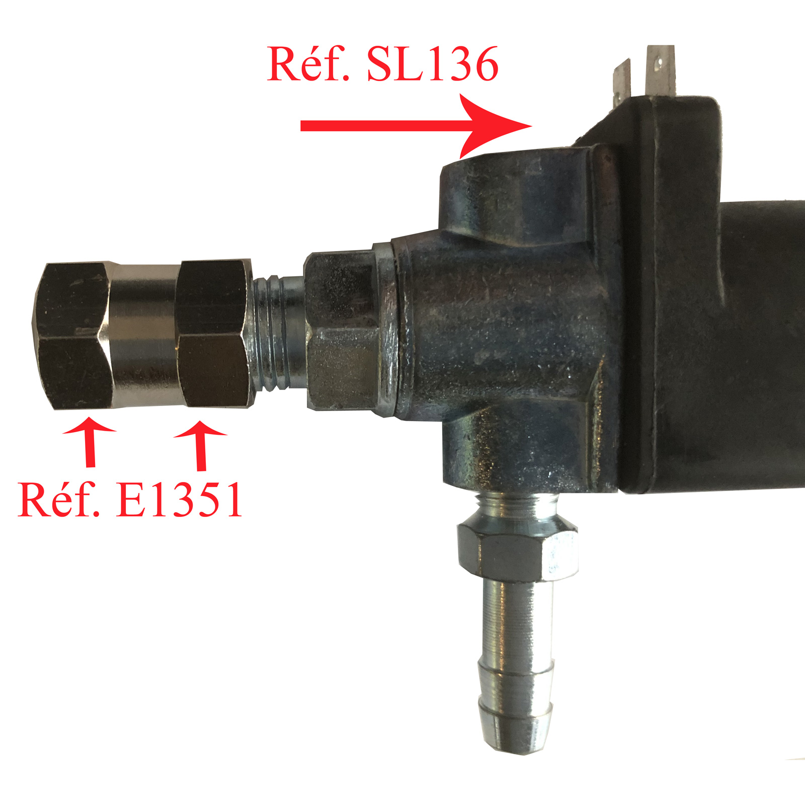 pour la sortie de l’électrovanne vous pouvez mettre un manchon ref E1351 puis après un raccord rapide Ref E1350 soir droit soit coudé.