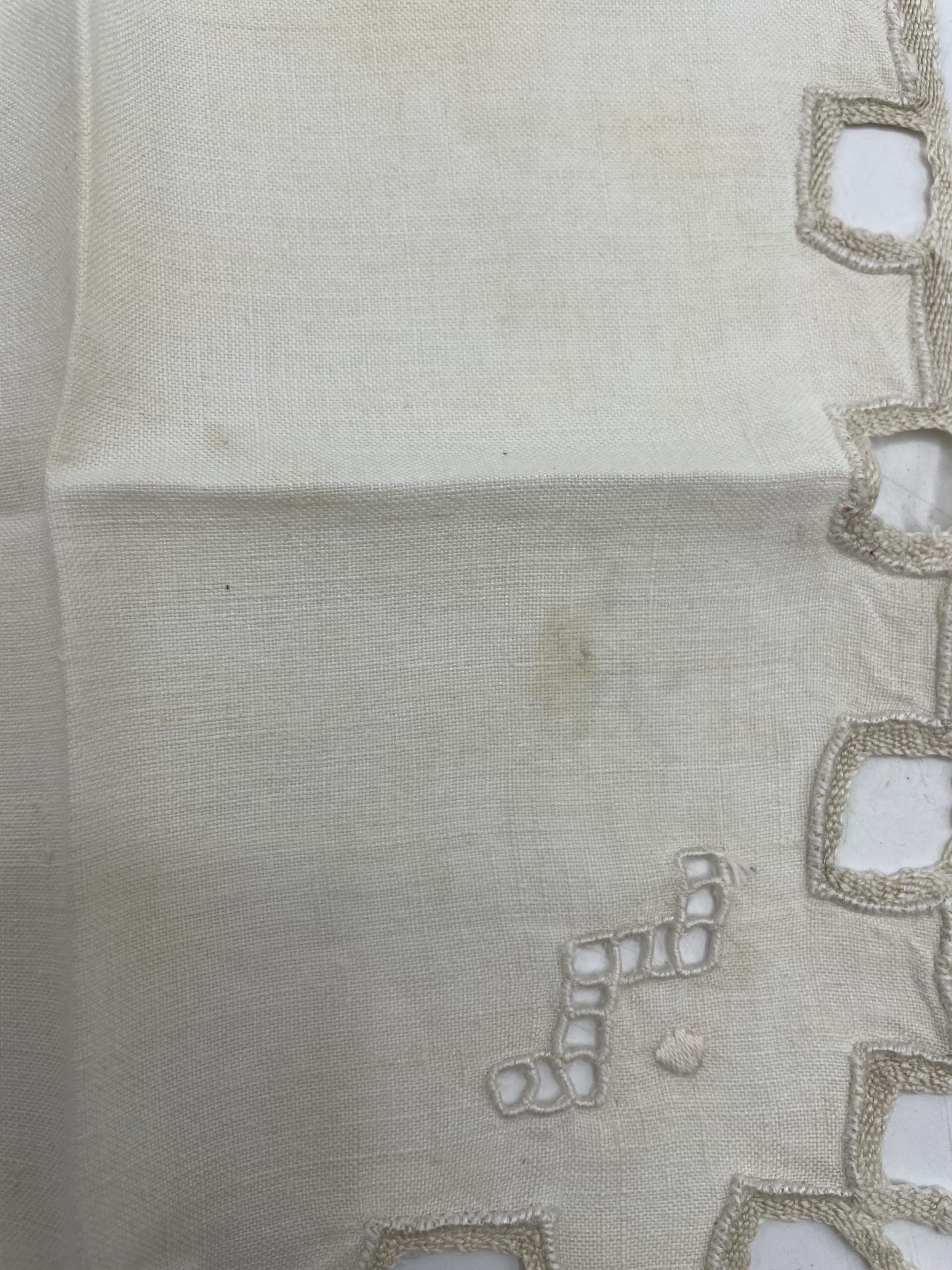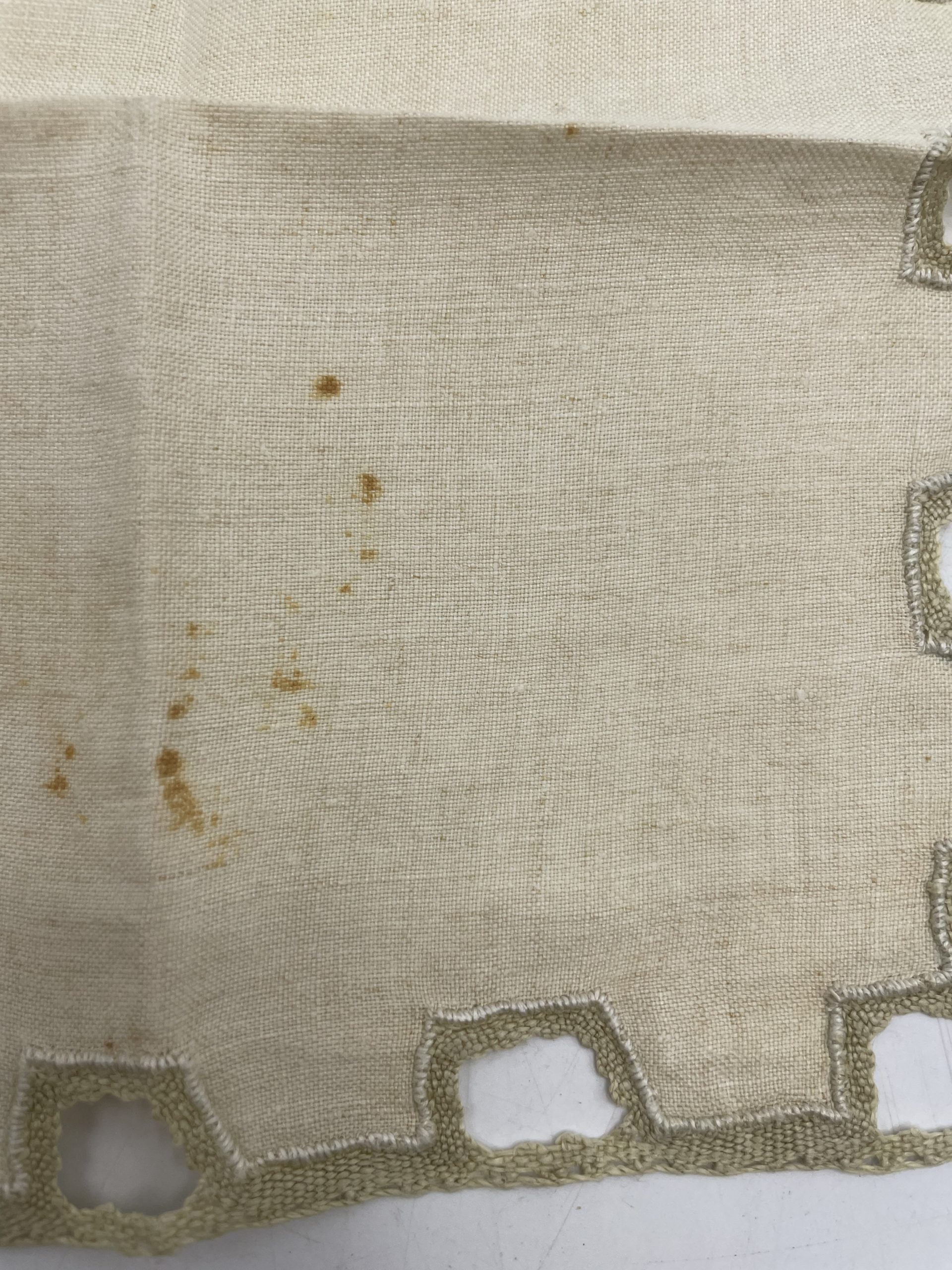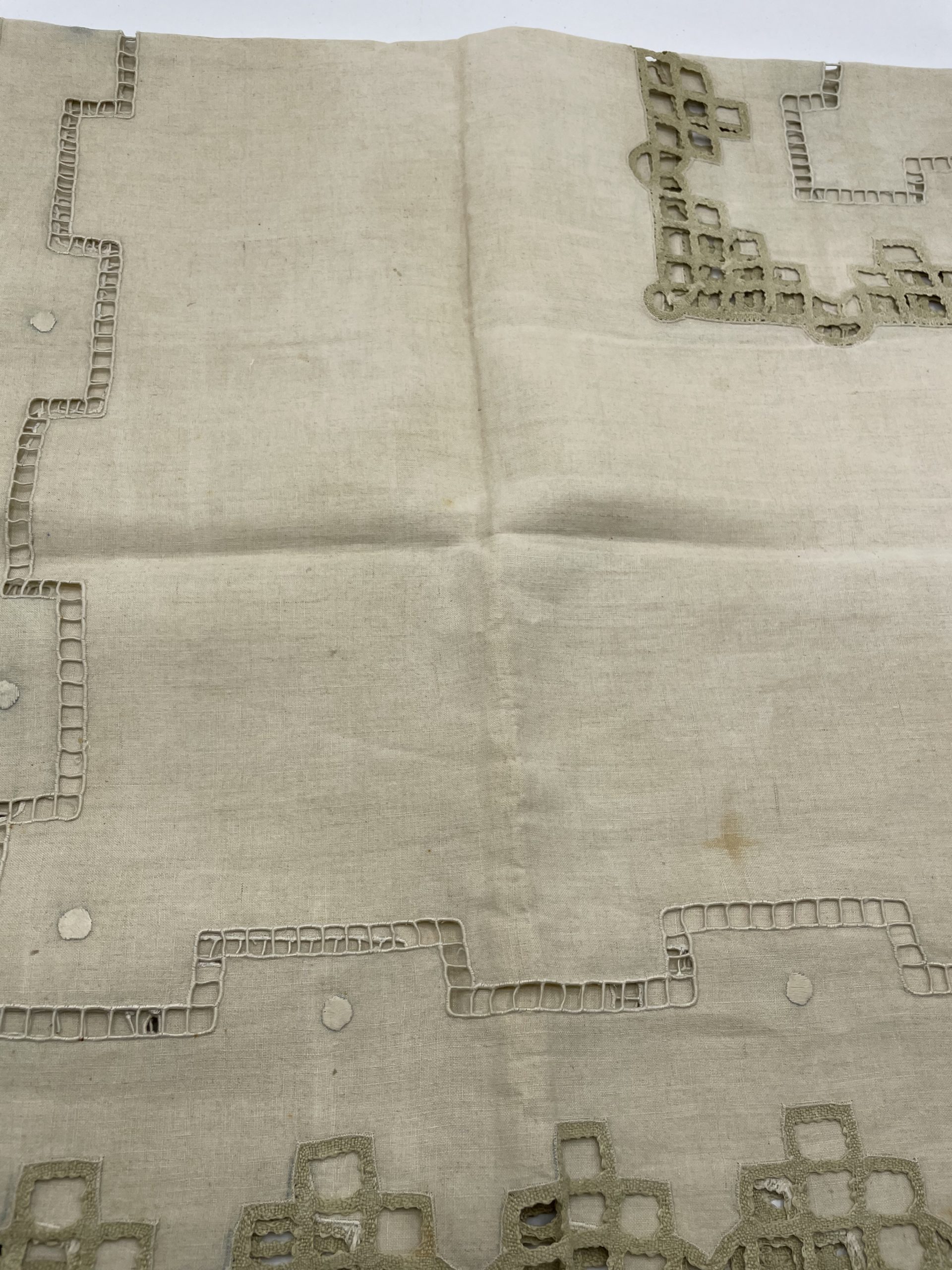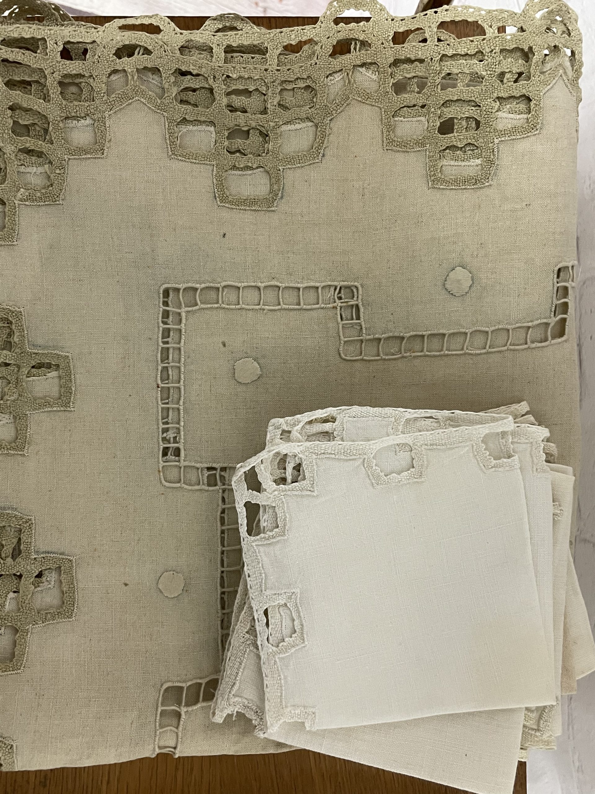 On adore ce magnifique set qui se compose d’1 nappe et de 9 napperons. Vintage, la nappe et les napperons assortis sont en lin brodé de forme carrée avec une jolie couleur beige entre le sable et le lin. Décoré de broderies de formes géométriques, la nappe a un symbole en broderie de forme géométrique au centre que l’on retrouve sur l’ensemble des napperons avec leurs effets de vide. Vintage, des traces d’usure et des petites tâches sont à prévoir (cf photos) jolies marques du temps passé. Magnifique !