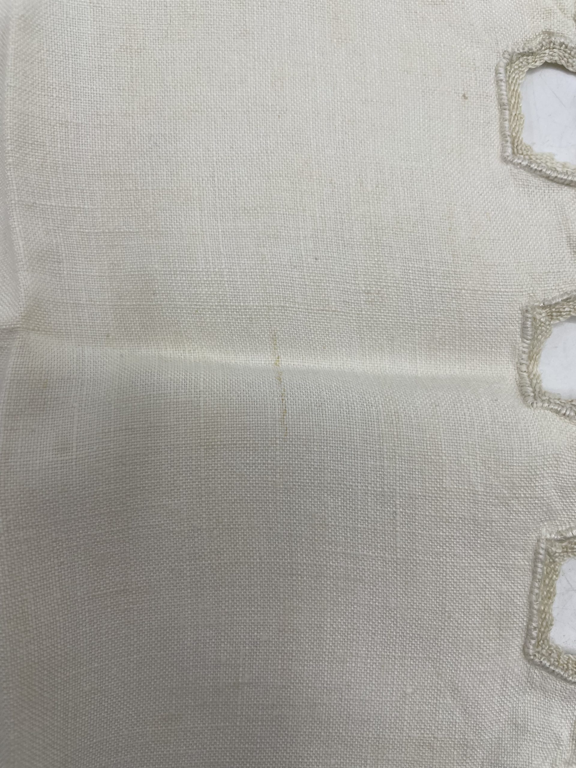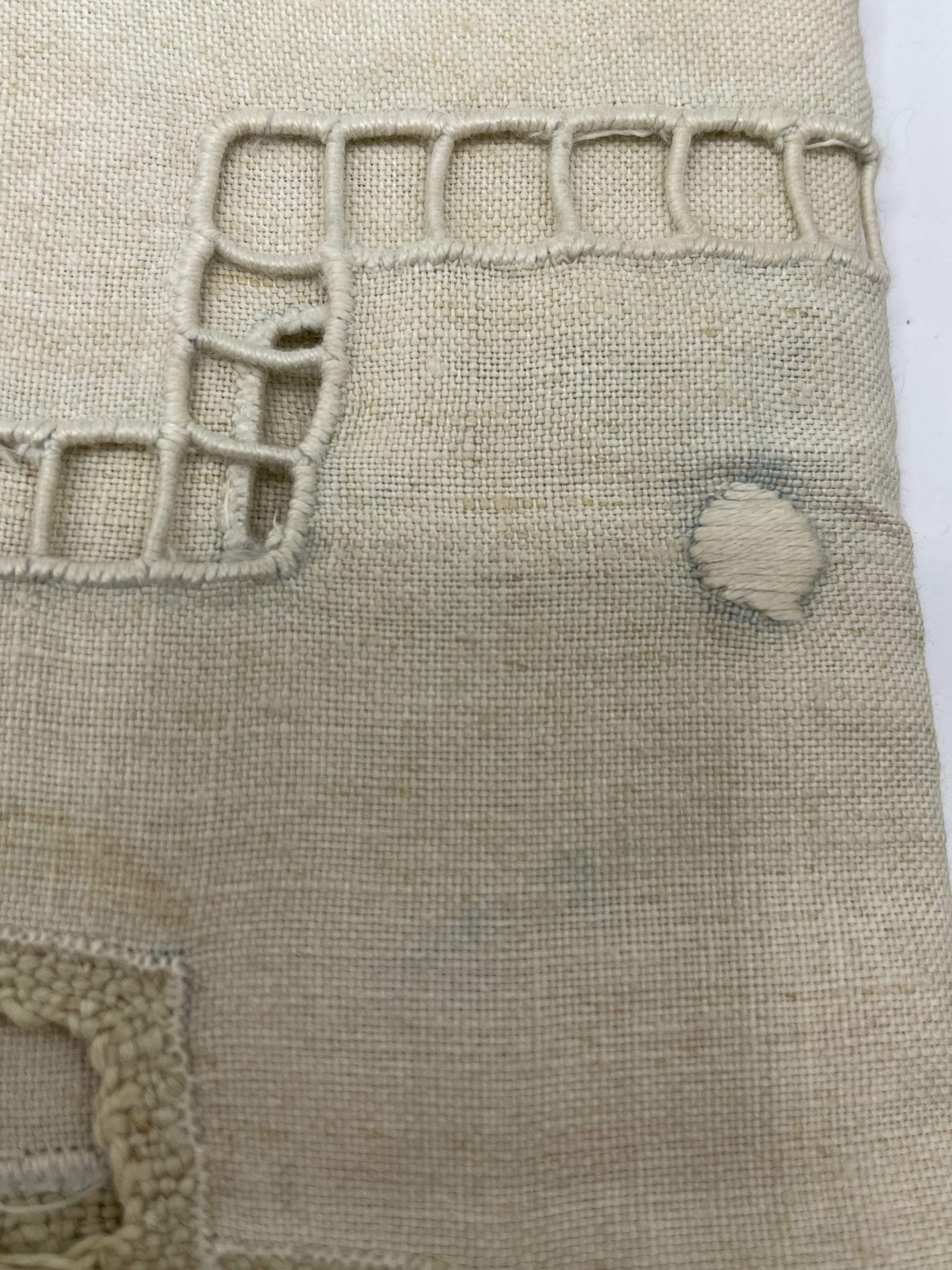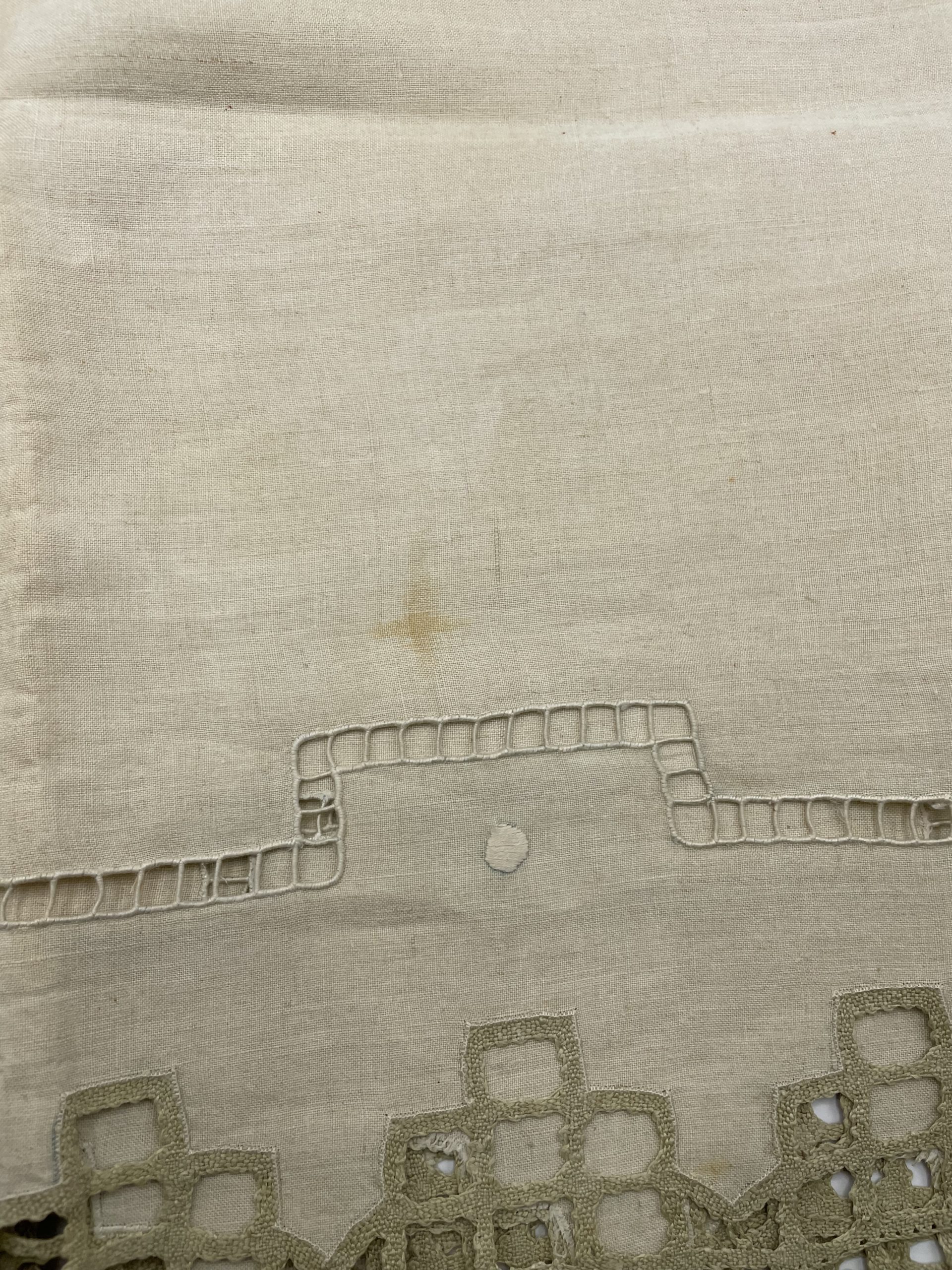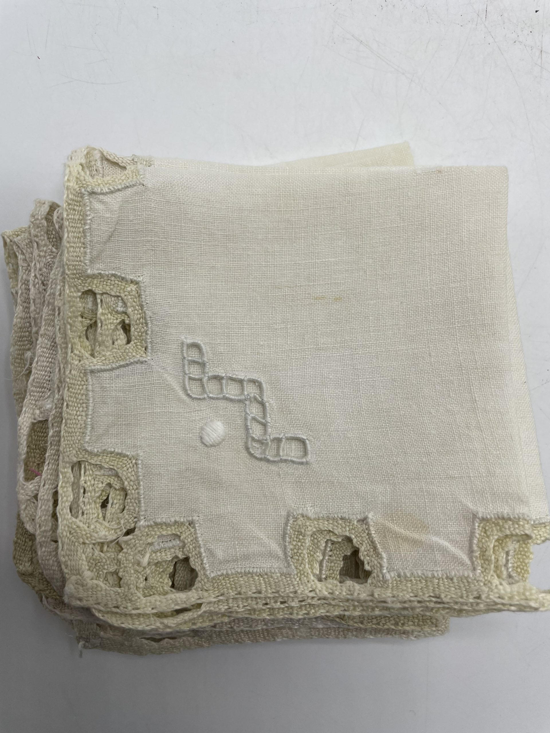 On adore ce magnifique set qui se compose d’1 nappe et de 9 napperons. Vintage, la nappe et les napperons assortis sont en lin brodé de forme carrée avec une jolie couleur beige entre le sable et le lin. Décoré de broderies de formes géométriques, la nappe a un symbole en broderie de forme géométrique au centre que l’on retrouve sur l’ensemble des napperons avec leurs effets de vide. Vintage, des traces d’usure et des petites tâches sont à prévoir (cf photos) jolies marques du temps passé. Magnifique !