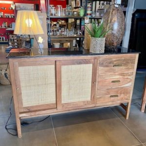 STRUCTURE EN ACIER, ÉTAGÈRES EN BOIS D’ACACIA. FINITION ACRYLIQUE DE PROTECTION.