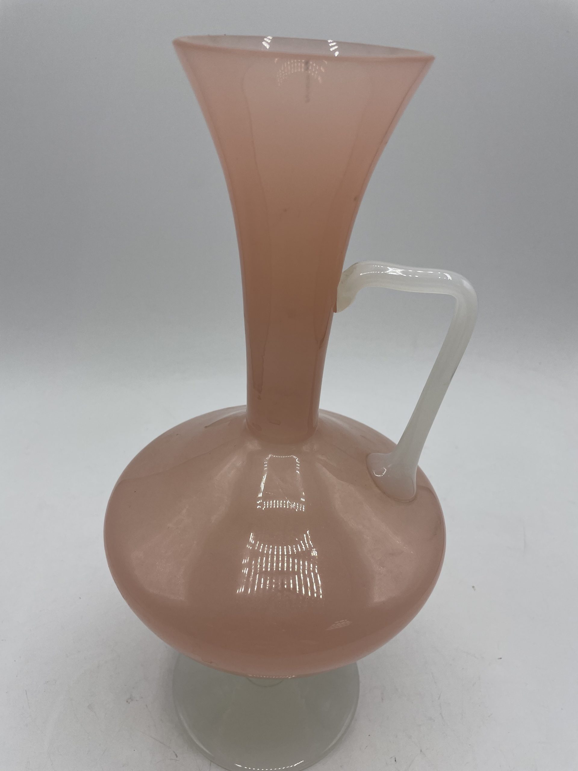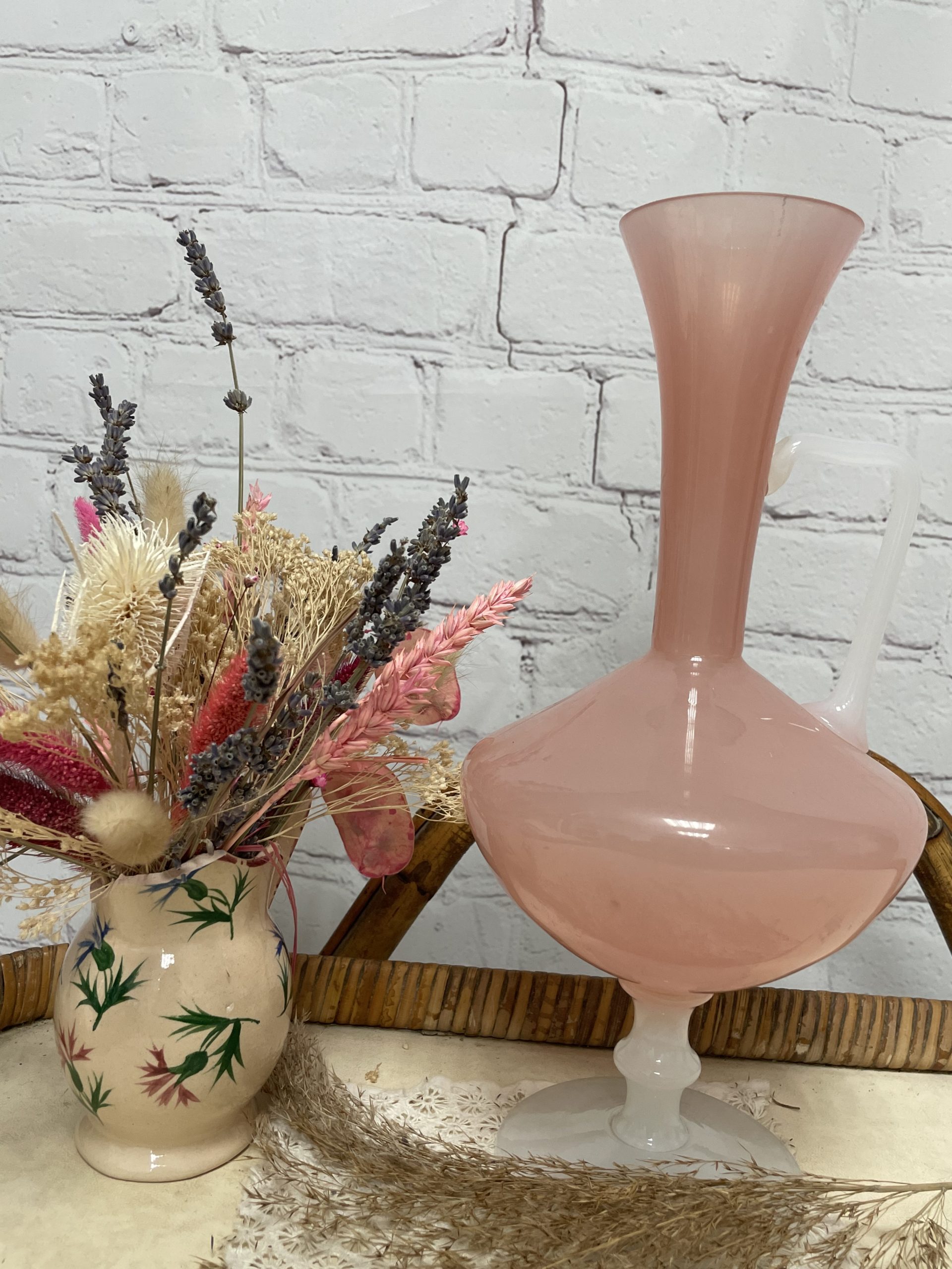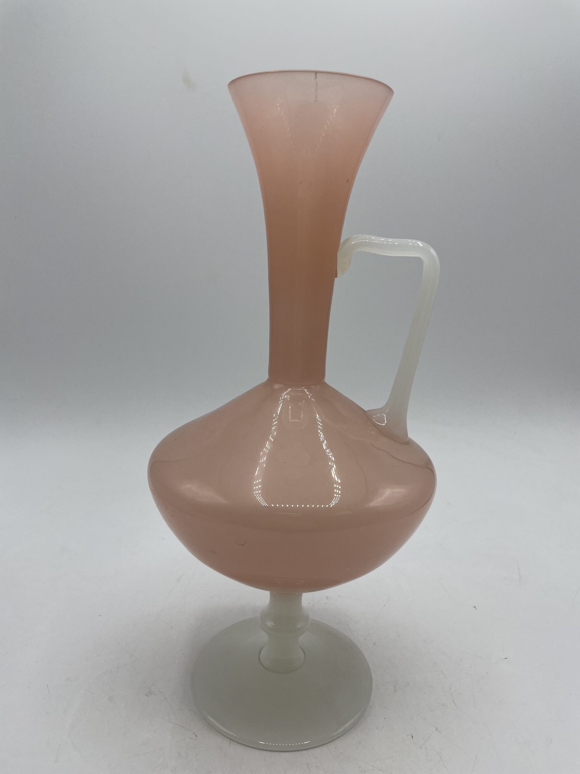 On adore ce joli vase vintage en opaline en forme de carafe. De couleur rose bonbon, le pied du vase et la anse sont de couleur blanche ce qui crée un joli contraste très doux. Soufflé à la bouche, il s’agit d’une pièce unique ! Vintage, des traces d’usure sont à prévoir (cf photos ) jolies marques du temps passé. Un joli vase parfait pour décorer une table ou un joli salon !