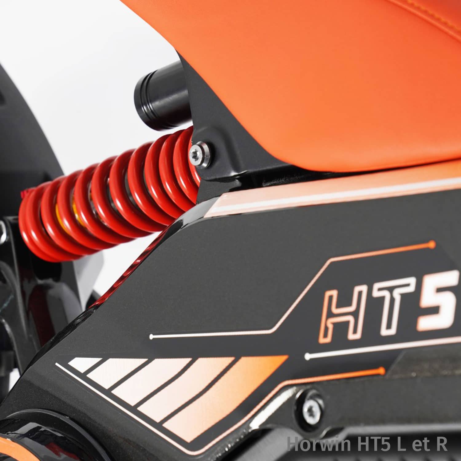 Les deux Horwin HT5 sont capables de franchir des gués pouvant atteindre jusqu’à 60 centimètres de profondeur. Leur garde au sol minimale est de 265 mm. Elles sont capables de grimper des pentes de 40 %. Leurs roues avant mesurent 19 pouces, arrières, 18 pouces. La HT5 L disposera de pneus typés route, tandis que la HT5 R est dotées de pneus cross. Sur les deux modèles et en dehors des roues, la partie cycle est identique : on trouve une fourche hydraulique réglable à l’avant, et un amortisseur réglable à l’arrière. Le cadre, guidon, compteur, selle, etc. Sont également identiques.