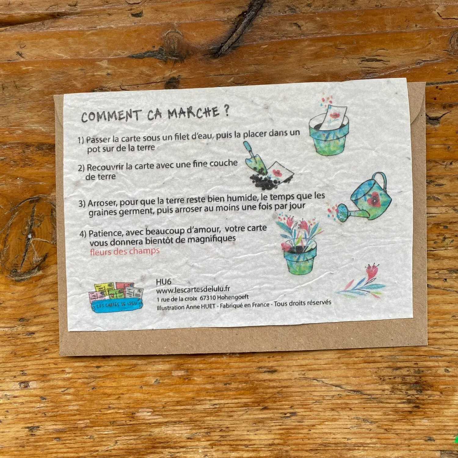 Les conseils d’utilisation ainsi que les graines présentes dans le papier sont indiquées au verso de la carte.