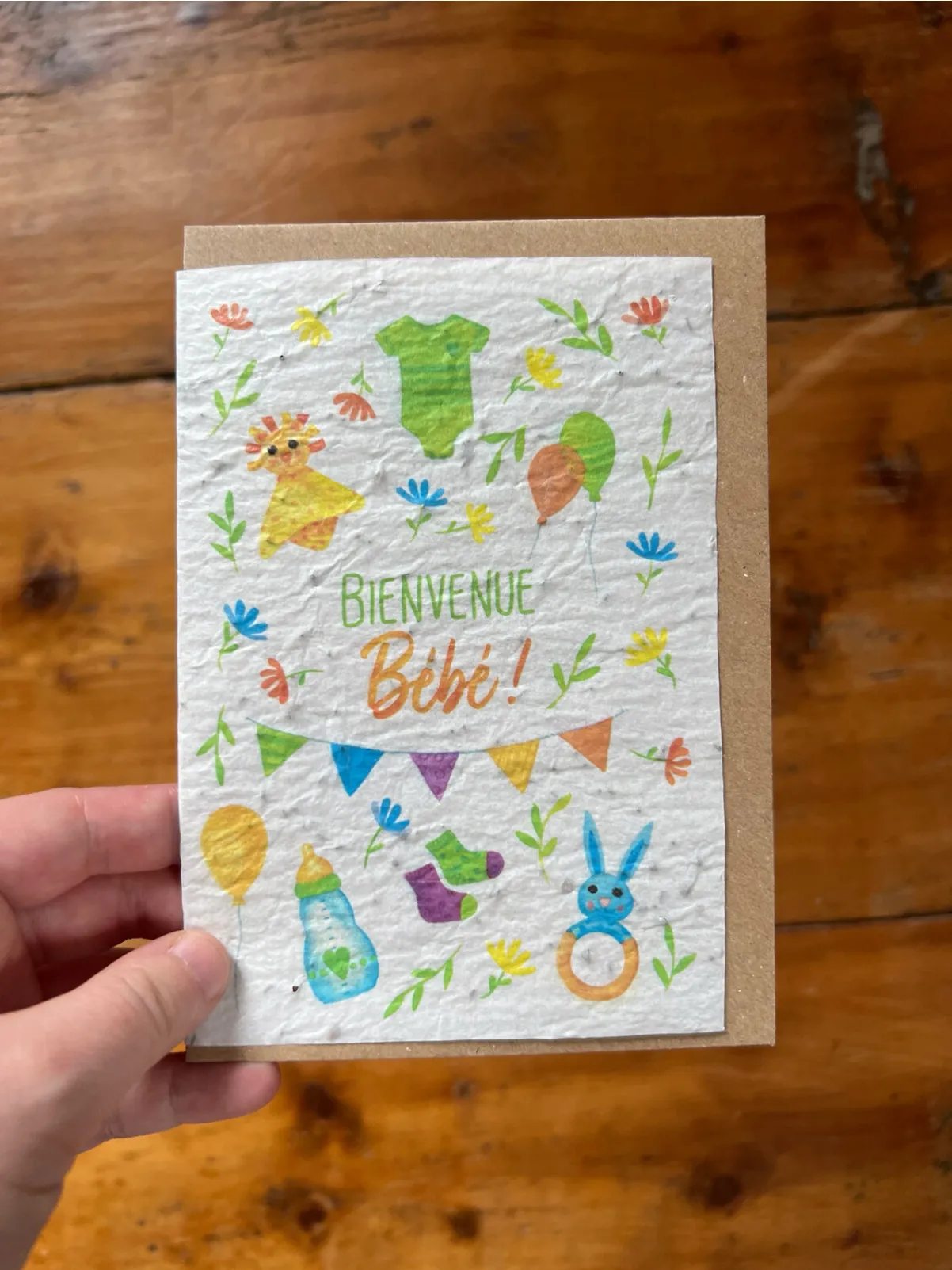 Fabriquée en France. Papier 80g biodégradable ensemencé de petites graines. Enveloppe kraft incluse.