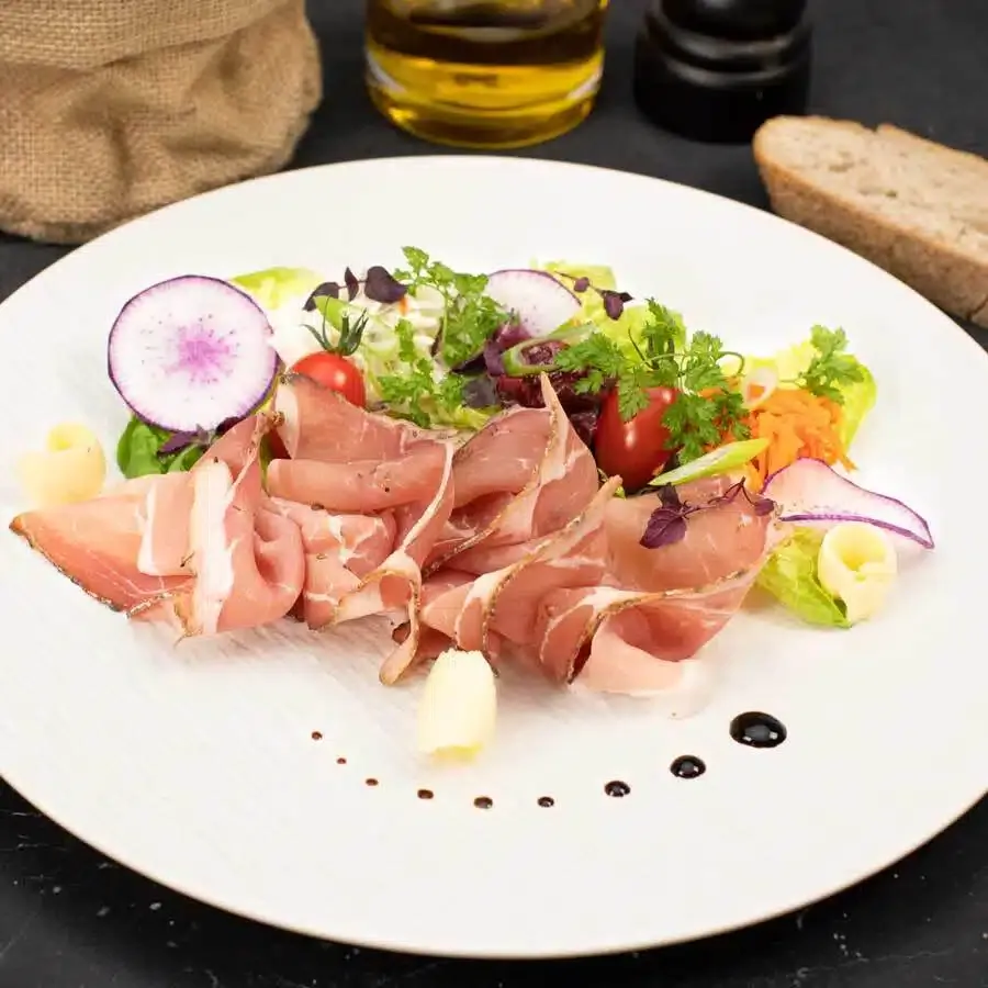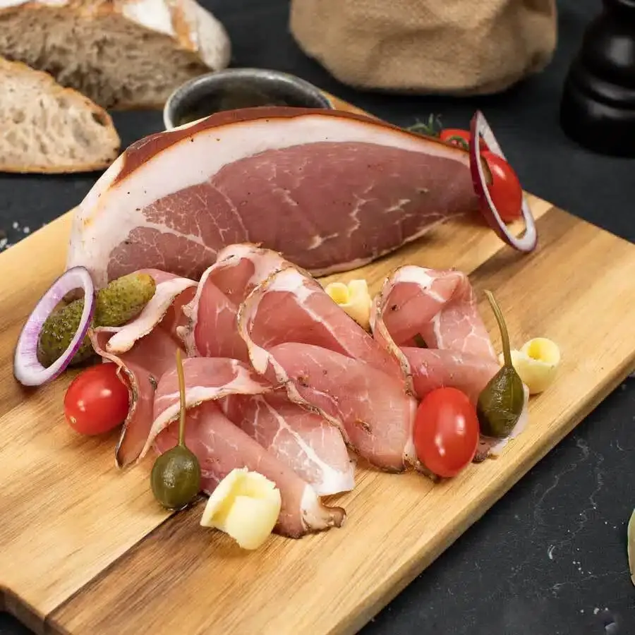 Coupé en fines tranches, ce jambon constitue une entrée remarquable, accompagné de melon ou dans une salade. Vous pouvez également l’accompagner d’une noisette de beurre sur une belle tranche de bon pain. Les tranches fines révèlent la texture tendre et la saveur riche du jambon.