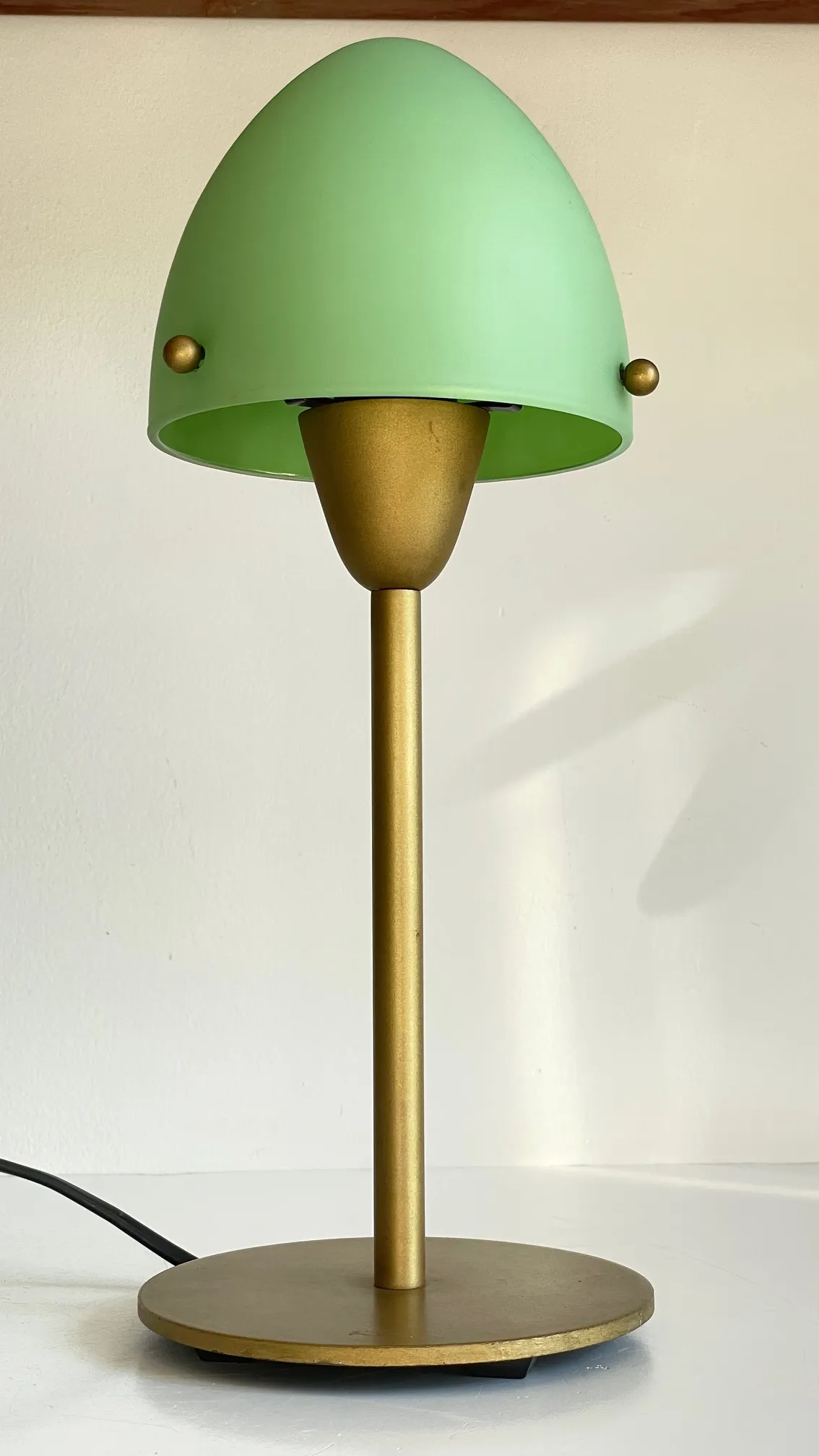 Très bon état, voire impeccable. acier Doré par projection de peinture texturée, verre Vert opalescent, étiquette au-dessous “SCE – Made in France” . Fonctionne Parfaitement, lampe nettoyée et testée, ampoule Fournie .