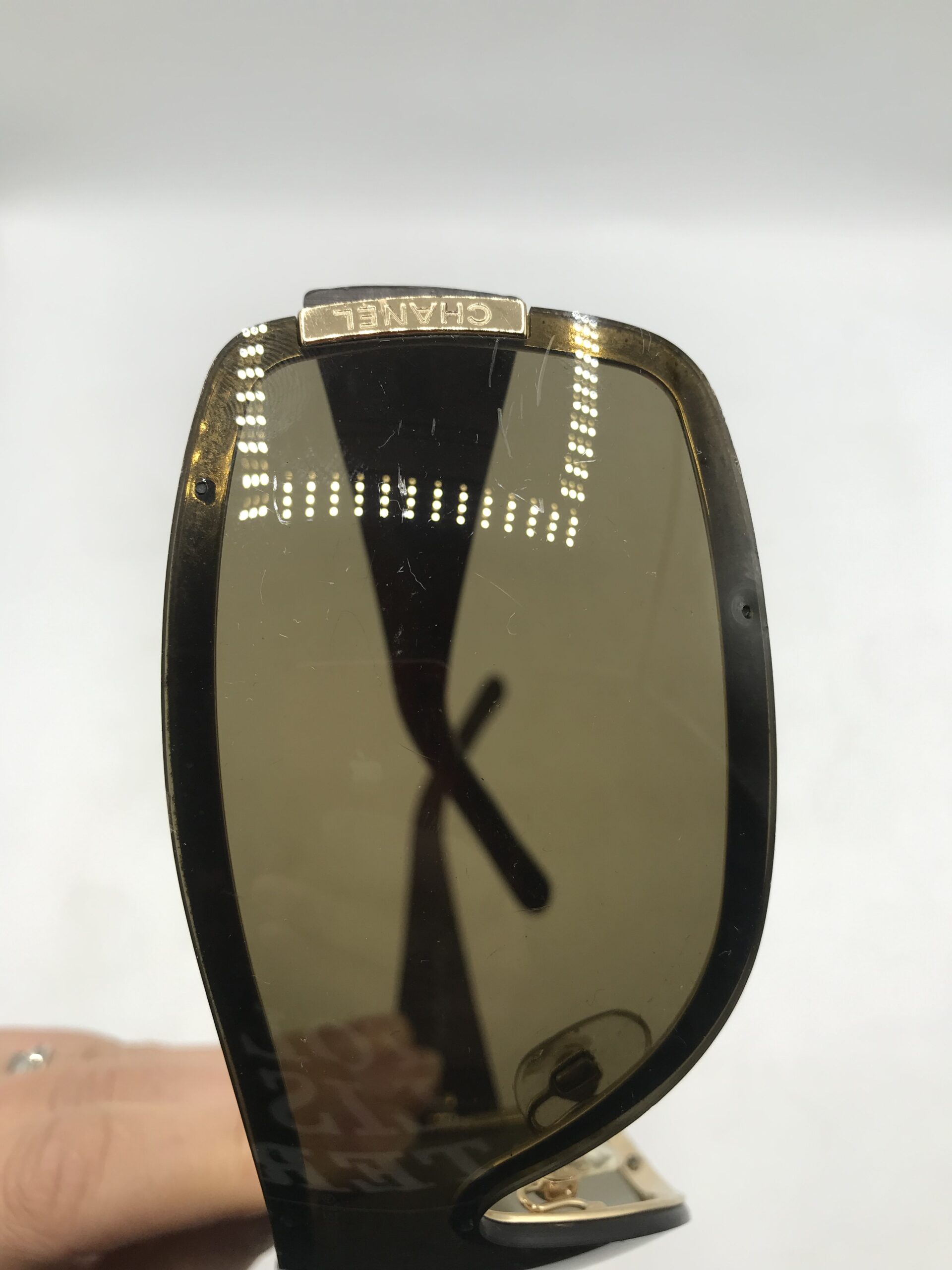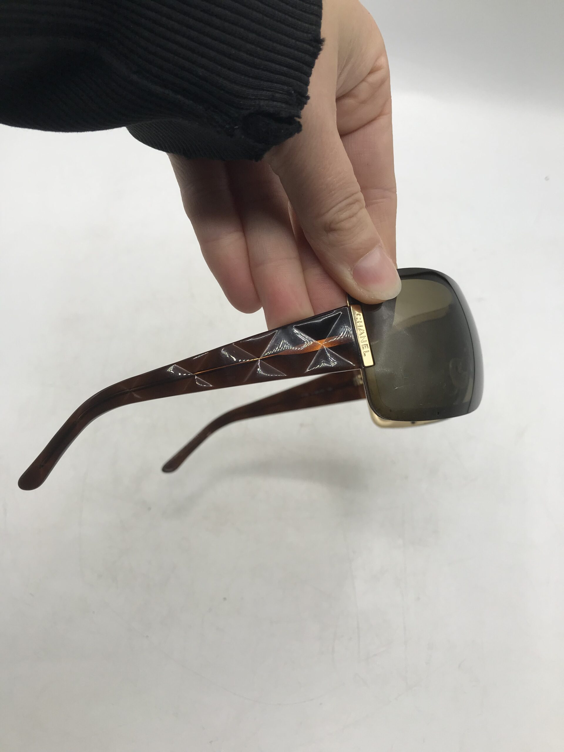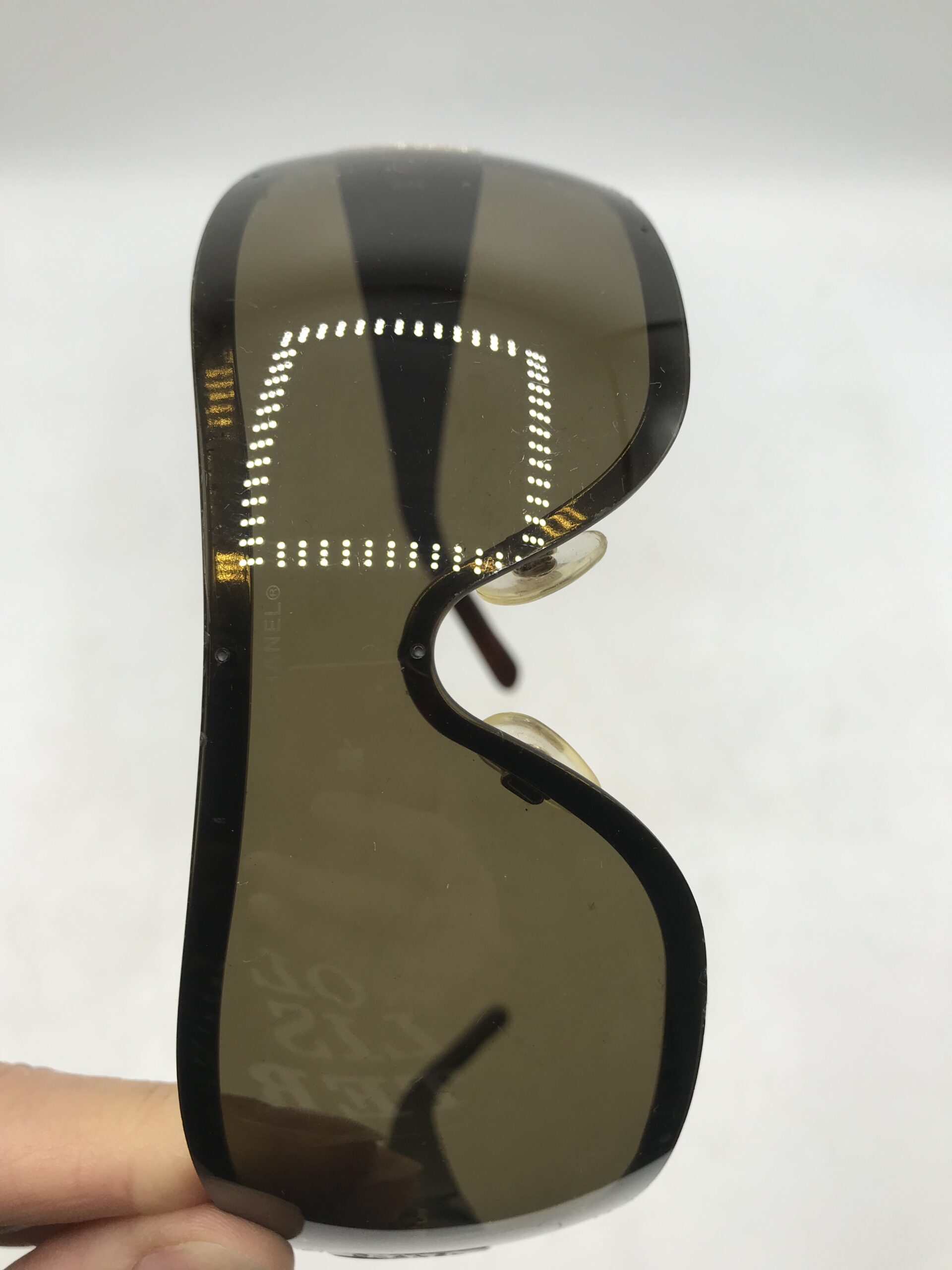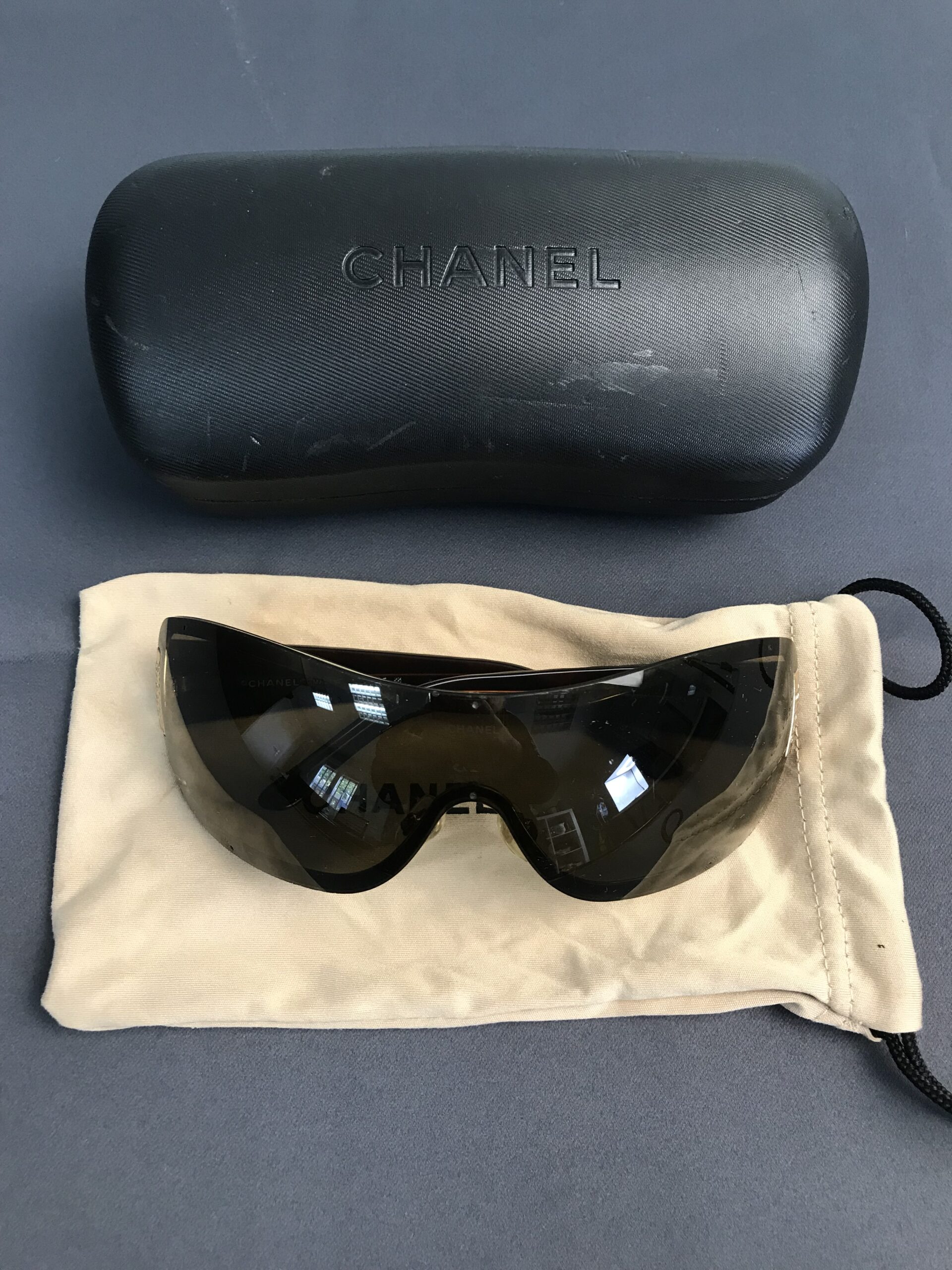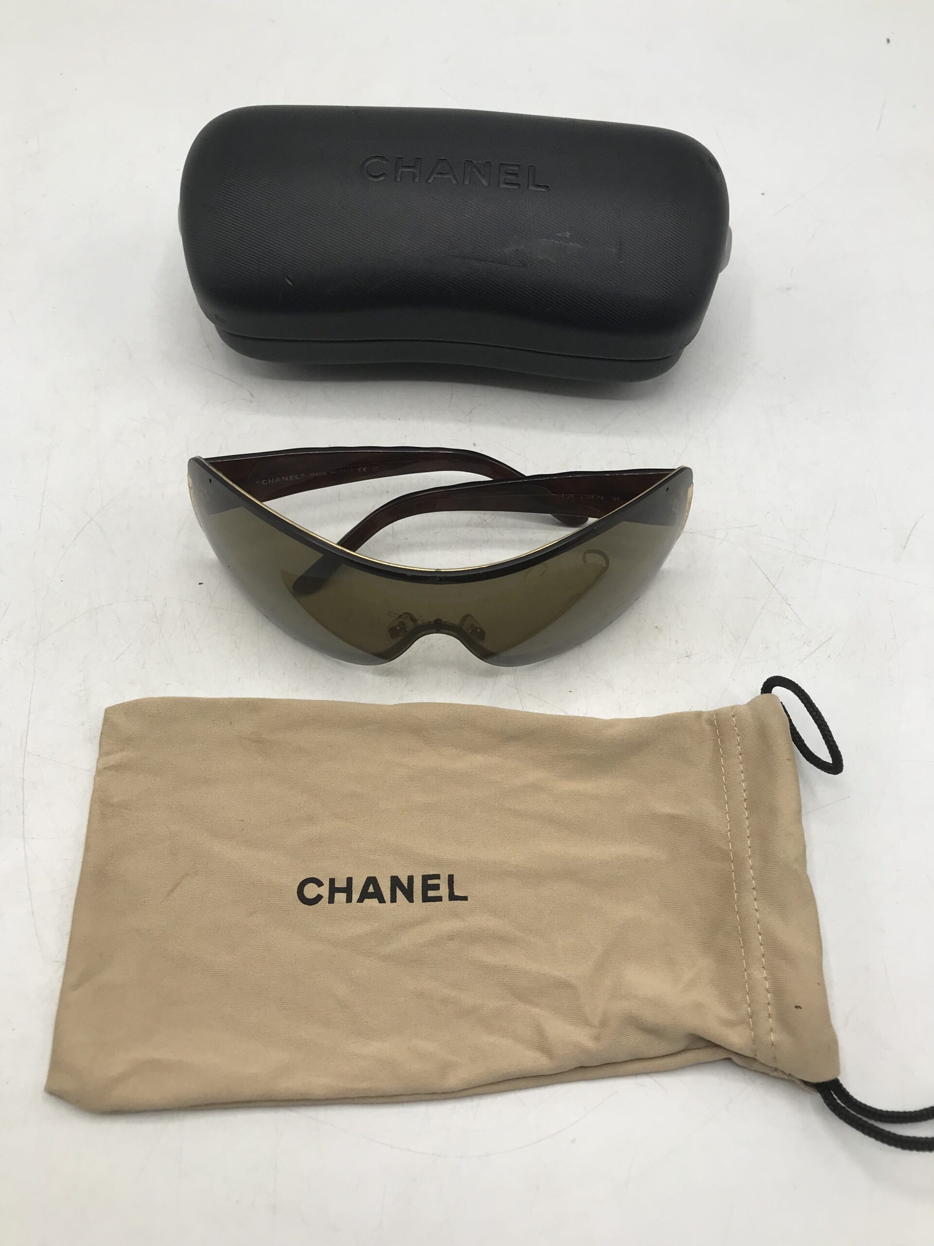Alerte grosse pépite !!! Lunette de soleil Chanel. Superbe lunette de soleil de la marque Chanel. Il est noté sur la branche 4126 c 125/73 120 d’un coté pour la référence du modèle et sur l’autre branche Chanel made in Italy. Les lunette sont en bon état générale. Elle présente des marque d’usure (cf photos) sur la monture. Le verre à de petites rayures sur un coté mais ne gène pas la vision (cf photos). Elles ont les branches en effet matelassé. Les verres sont de couleur marron. Elle sont livrées avec leur boite de protection d’origine qui porte des marques sur le dessus (cf photos), et un petit sac en tissu pour les protéger. Une belle affaire a saisir pour les connaisseurs et amateurs de la marque. Adopter un look chic et choc en mode seconde vie.