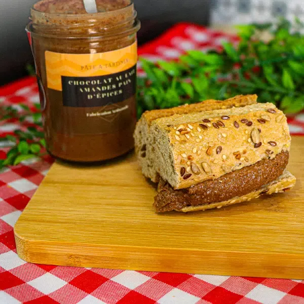 La pâte à tartiner alsacienne au chocolat au lait, amandes et pain d’épices marie la douceur du chocolat au lait avec le croquant des amandes et les arômes réconfortants du pain d’épices. Onctueuse et riche en saveurs, elle se déguste avec délice sur du pain frais, des crêpes ou des gaufres, offrant une expérience gustative unique et chaleureuse. Un véritable régal artisanal qui évoque les traditions alsaciennes.