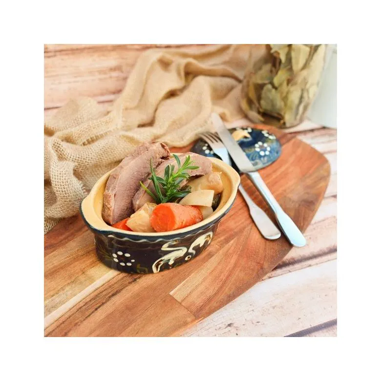 Prêt à être réchauffé au bain-marie durant 30 minutes (bocal ouvert) ou dans une casserole à feu très doux pendant 20 minutes. Le bocal de 1 litre convient pour 2 à 3 personnes.