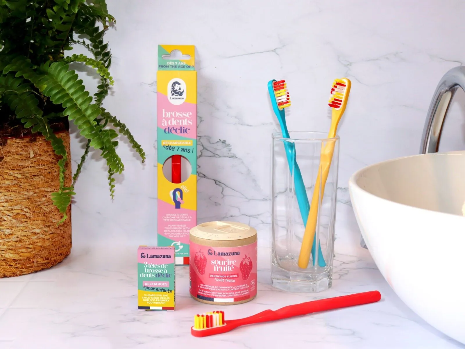 Les recharges de têtes pour brosse à dents enfants sont constituées d’un socle en ABS (acrylonitrile butadiène styrène) injecté près d’Angers et de poils en nylon provenant d’Allemagne et composés à 60 % d’huile de ricin (ressource renouvelable) et d’une bague en cuivre.