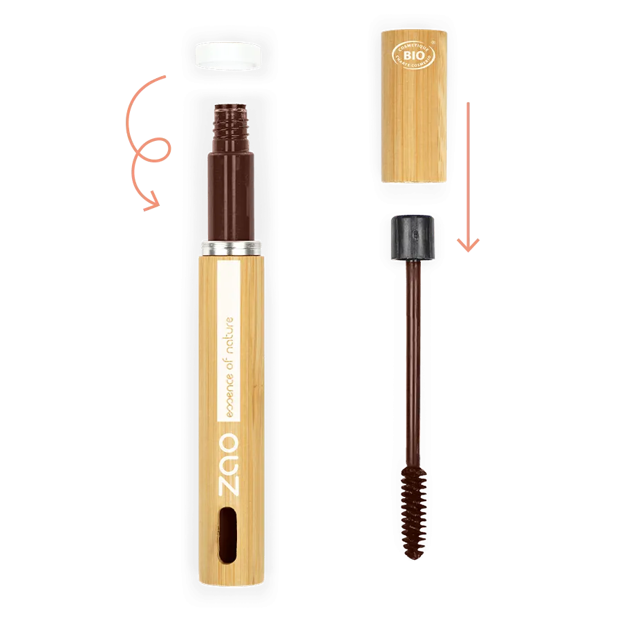 Pour remplacer la recharge : Ouvrez le mascara et dévissez la bague blanche. Refermez le mascara et sortez le tube à changer. Tirez sur le bouchon en bambou et installez le sur la nouvelle recharge. Insérez la recharge, et ouvrez la pour revisser la bague blanche.