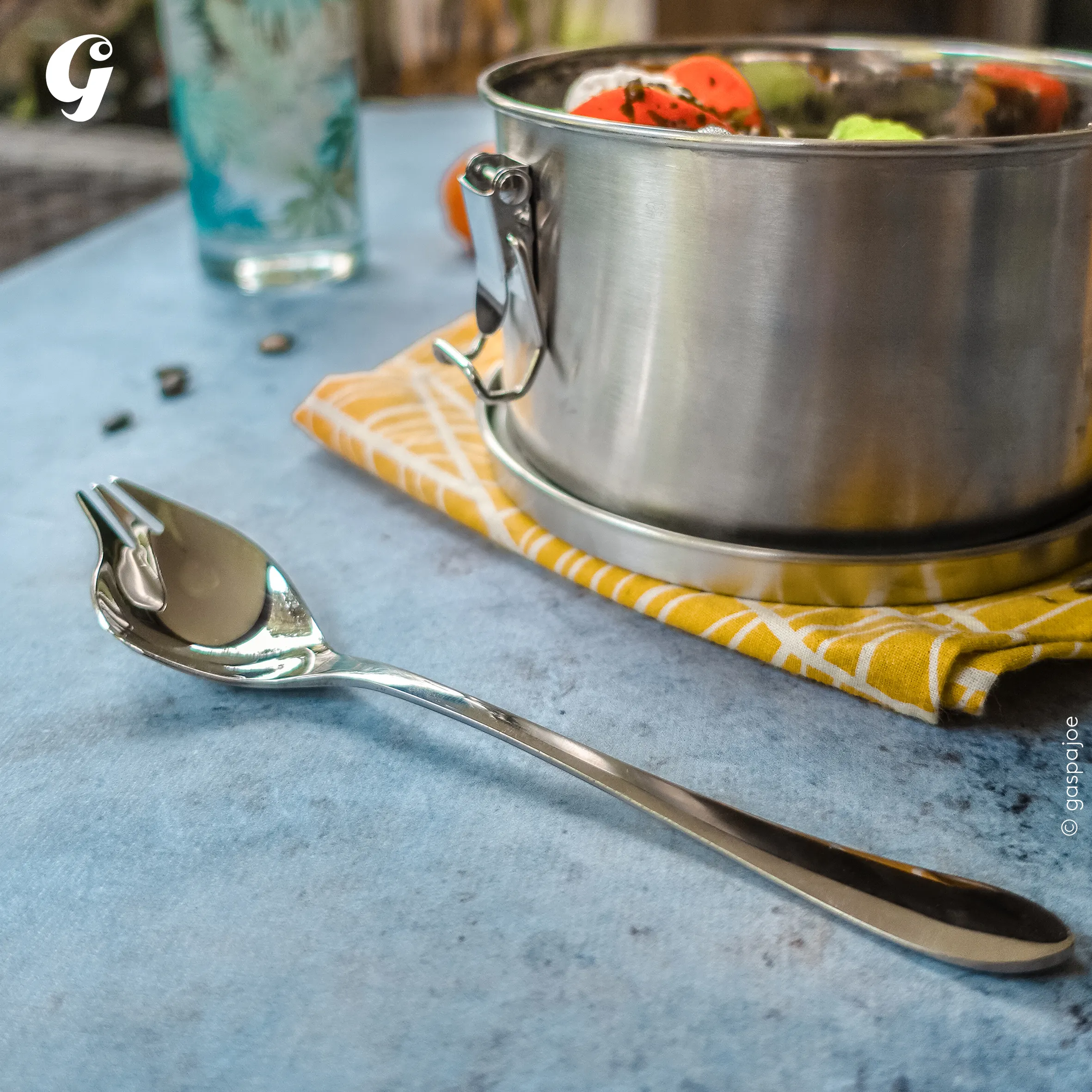 Cuilière-fourchette 2en1 100 % inox (inox 304 (18/8). Fabriquée en Chine par une usine partenaire de la marque Gaspajoe, choisie pour son savoir-faire et son respect du droit du travail international.