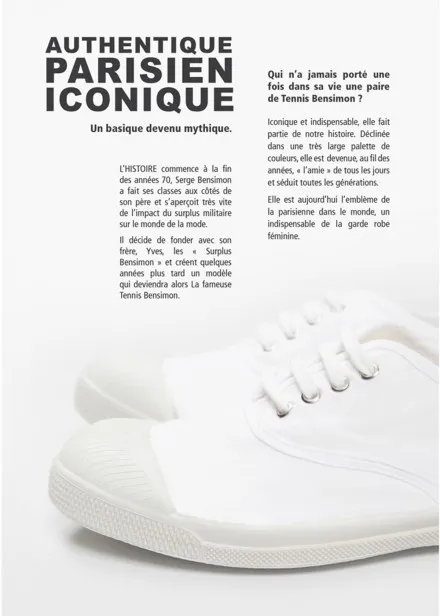 Pour la petite anecdote, la tennis lacets est le tout premier succès de la marque. Mais surtout, le meilleur tour de magie de Serge Bensimon. En 1978, les Bensimon reçoivent 100 000 tennis de gymnastique blanches de l’,armée française. Ces tennis, Serge va les teindre. Après un véritable travail de recherche et un long processus de développement, il met au point une technique capable de colorer la toile sans déborder sur le caoutchouc. Paf, inspiré de cette expérience, Serge imagine un nouveau modèle : la fameuse tennis à lacets. Iconique, intemporelle, indémodable, Incontournable… La tennis lacets, c’,est comme la chemise blanche : tout le monde devrait en avoir (au moins) une paire dans son vestiaire. Un modèle qui n’,a pas pris une ride depuis 1979 et qui se transmet toujours de génération en génération. Ce coloris fait partie des permanents : c’est-à-dire qu’il va avec tout et qu’il n’a pas de date de péremption.