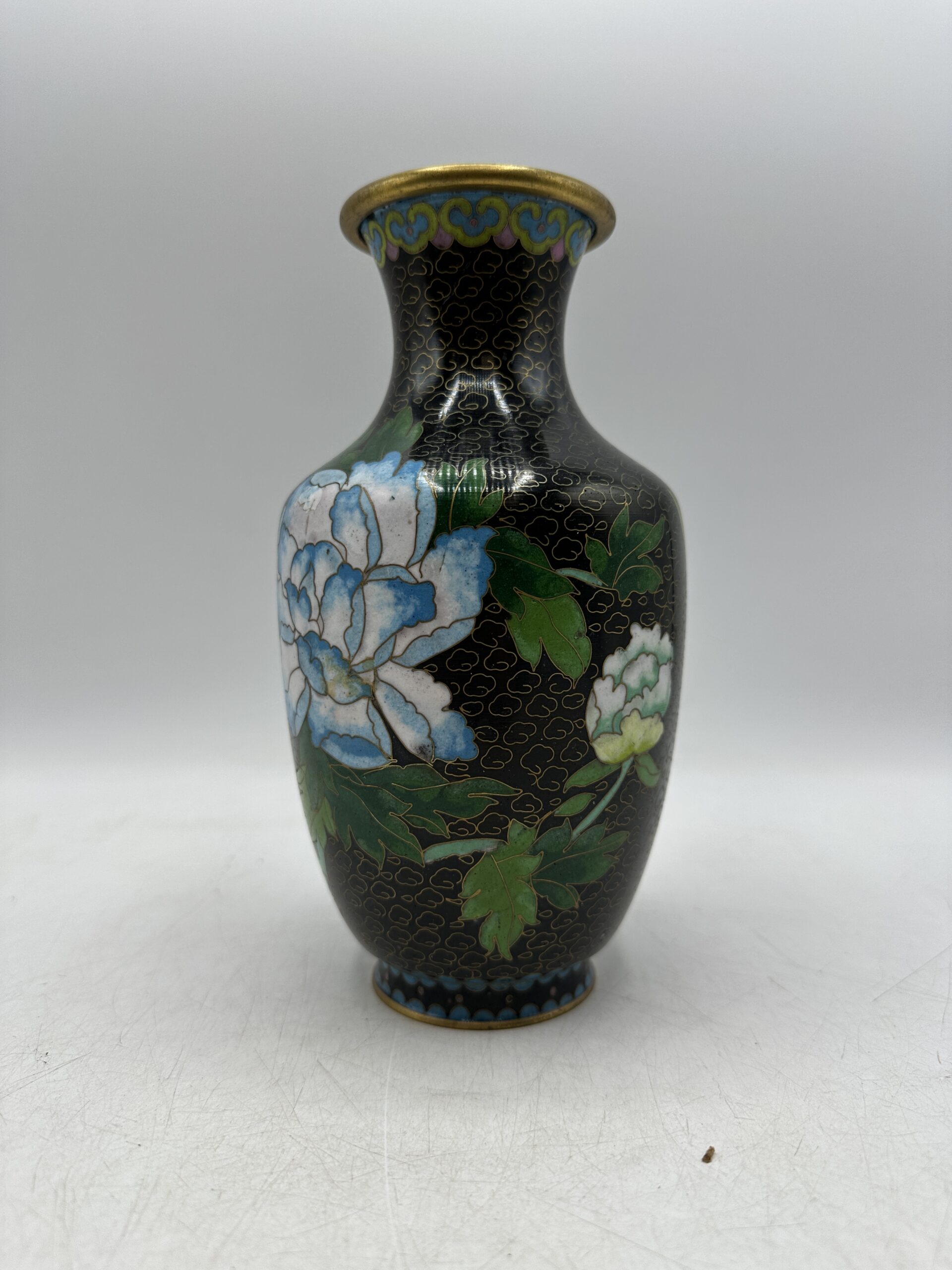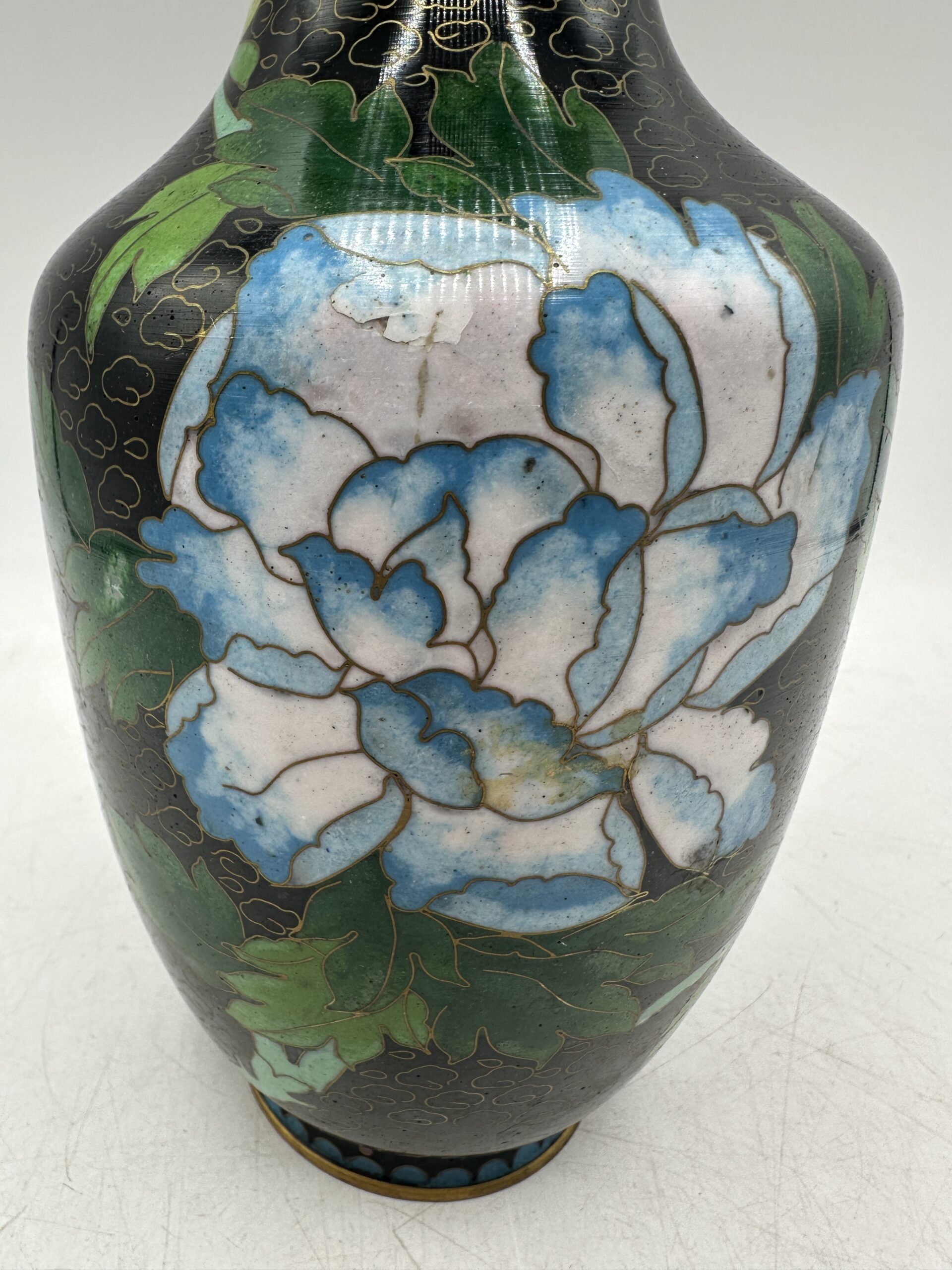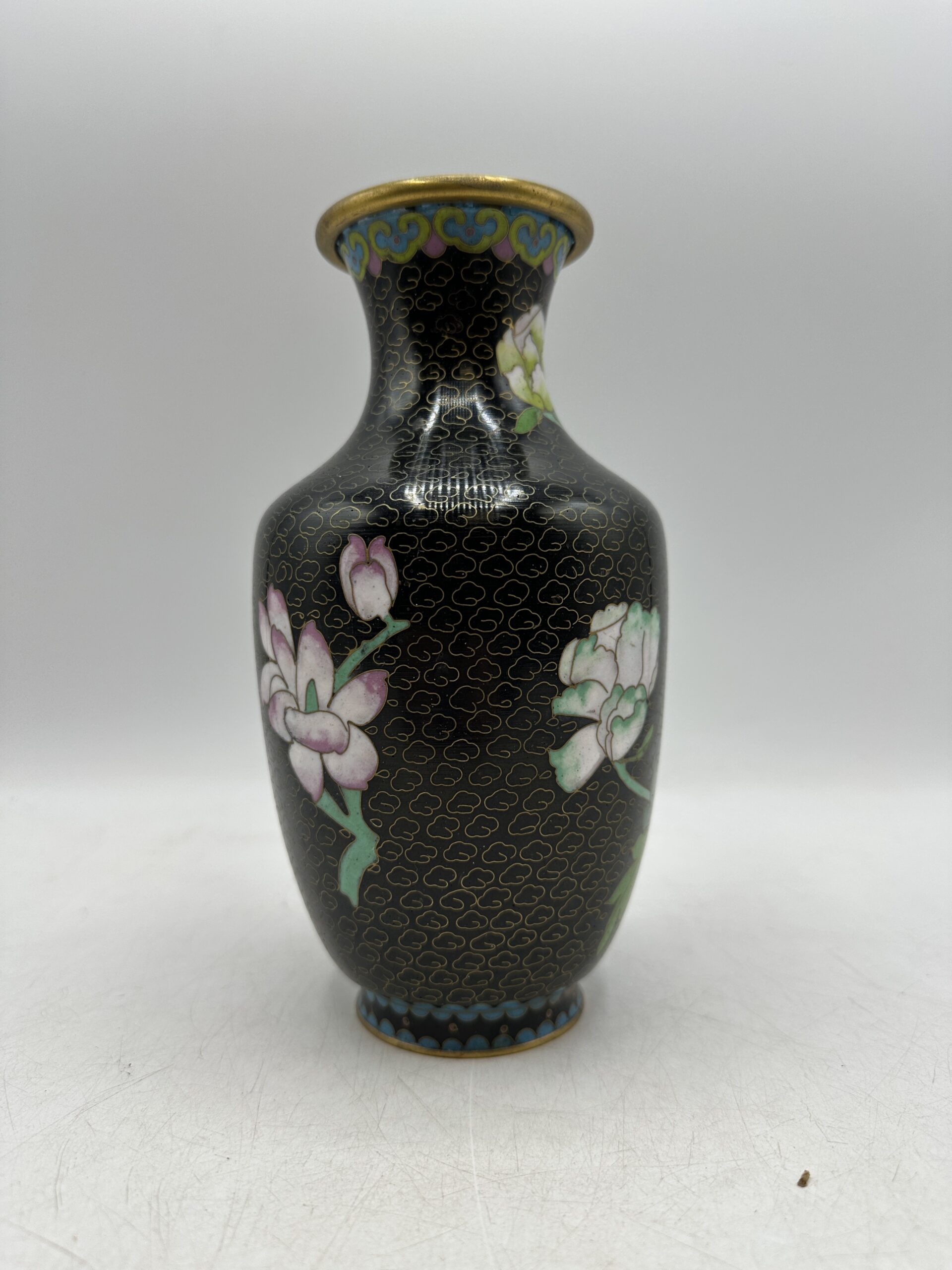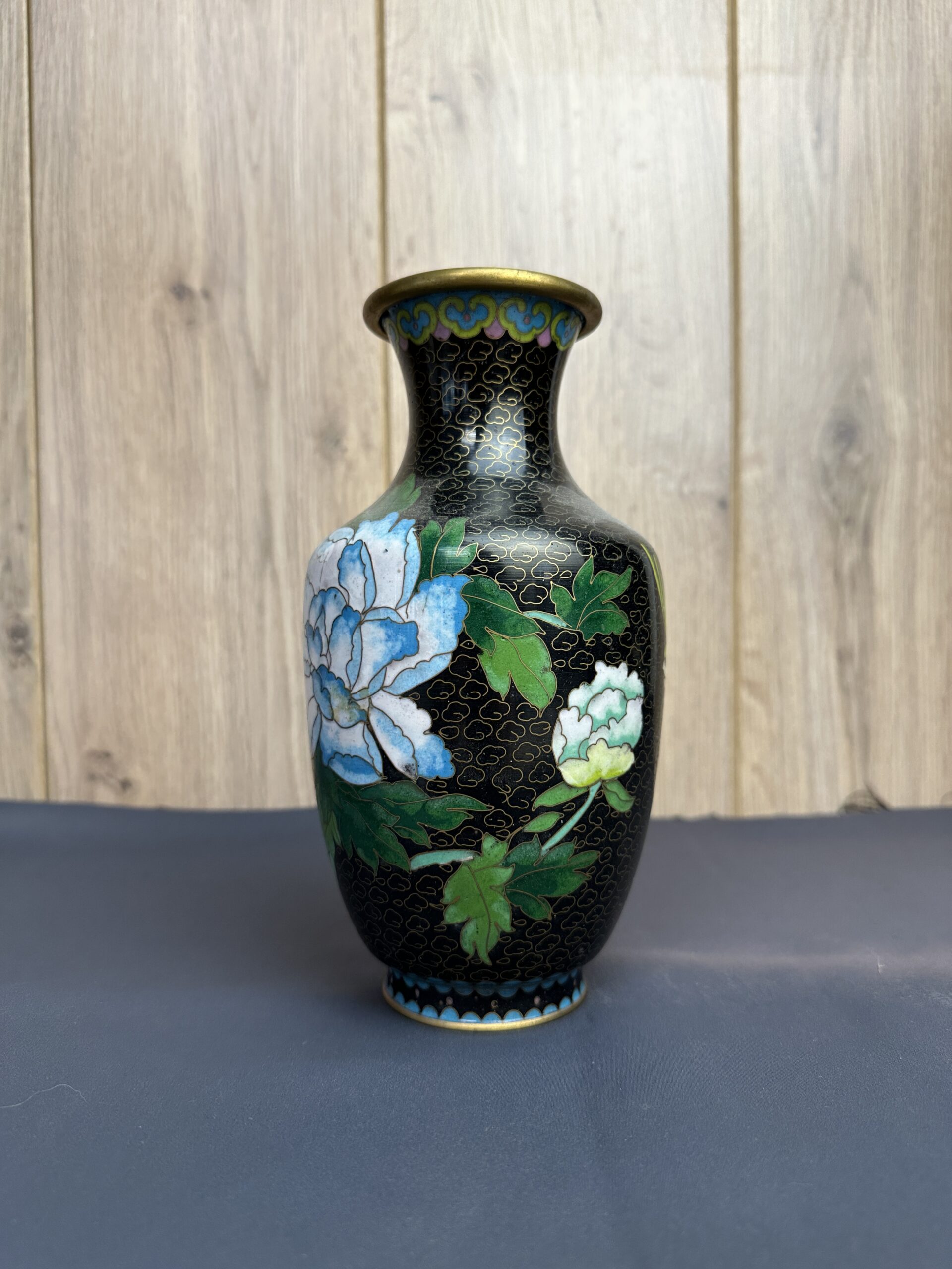 Vintage et ancien, ce vase cloisonné chinois décor fleuri a quelques traces d’usures normales (voir les photos)