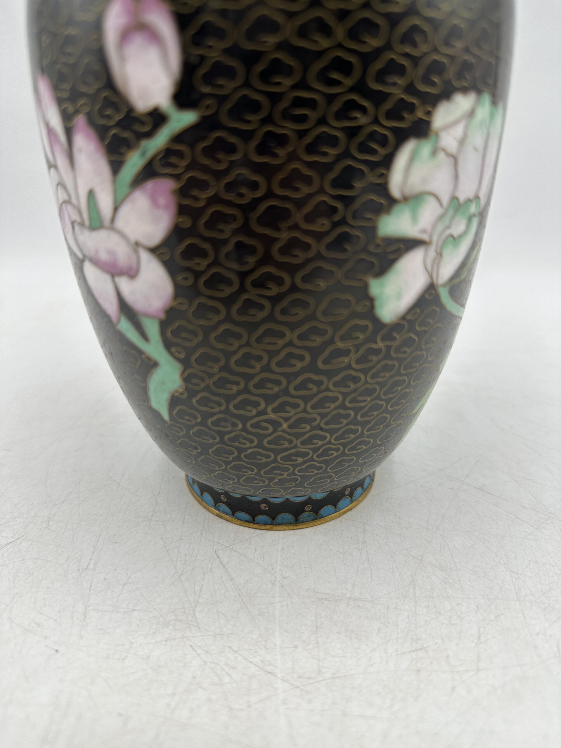 Ce très joli vase cloisonné arbore un décor avec différentes fleurs plus ou moins imposantes, allant du bleu au vert et au rose. Sur un fond noir avec des détails dorés ainsi qu’une frise bleue sur le pied du vase.