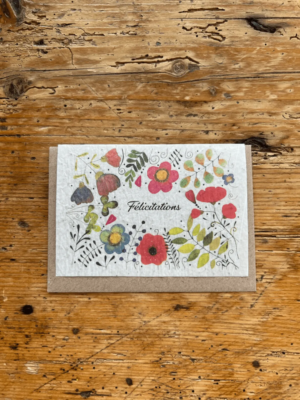 Fabriquée en France. Papier 80g biodégradable ensemencé de petites graines. Enveloppe kraft incluse.